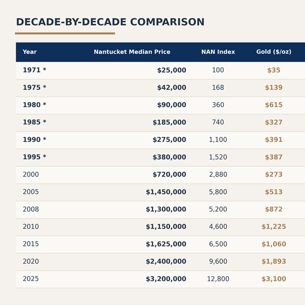 Since 1971 — when President Nixon severed the U.S. dollar's link to gold and launched the modern era of freely traded hard assets — three investments have defined wealth preservation for discerning investors: gold bullion, the S&P 500, and Nantucket Island real estate.