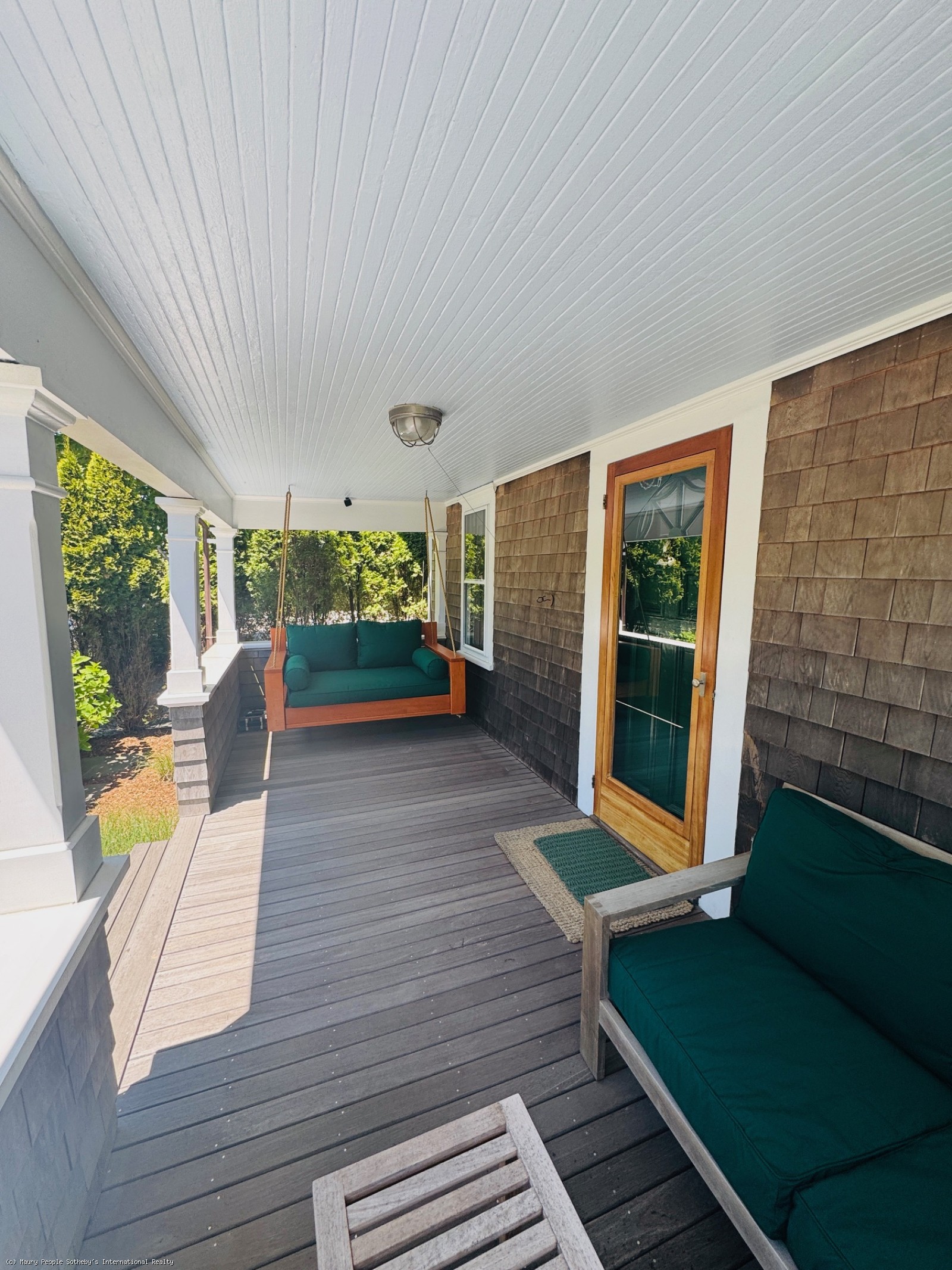 This delightful, beautifully-renovated and completely updated three bedroom bungalow is situated just minutes from the top of Main Street - an ideal location in walking distance to Town, while easily accessible to beaches, bike and jogging paths and all points East & West. Styled in a "beach chic" aesthetic yet retaining its charm, the house offers all the modern amenities and appointments. The landscaping adds to the appeal of the house: there is a small, nicely manicured yard, back deck for dining, and mature arborvitae planted for privacy. The front door opens to living/dining area with a gourmet kitchen featuring granite countertops and top of the line appliances. There are two bedrooms (one with a private bath) and a half bath off the living area. The second floor has a full modern bathroom complete with two twin size trundle beds (4 twin beds total) and a large bay window sitting area.