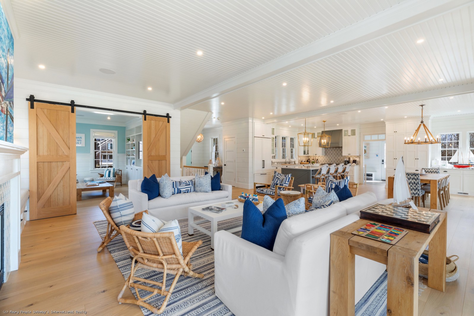 The generous backyard is a true retreat, featuring a pool with automatic cover, hot tub, children’s play structure, expansive lawn, and an outdoor fire pit — the perfect setting for relaxed summer evenings under the Nantucket sky.