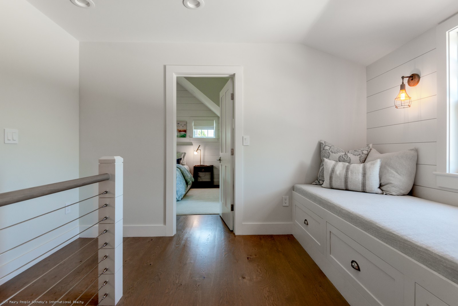Landing with large built-in window seat and two bedrooms featuring walk-in closets plus additional storage and ensuite bathrooms- each with a shower.