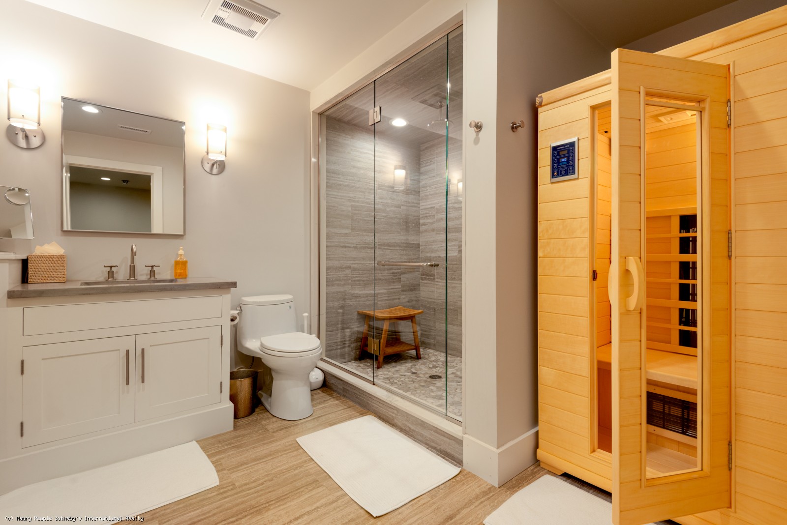 Landing from the main level; large living area featuring a paneled feature wall with media and wet bar including Sub Zero drink drawers and under counter wine storage; laundry room with ample storage and sink; bedroom with panel details and built-ins; full bath with steam shower and Thermal Life Sauna; and an exterior staircase; powder room.