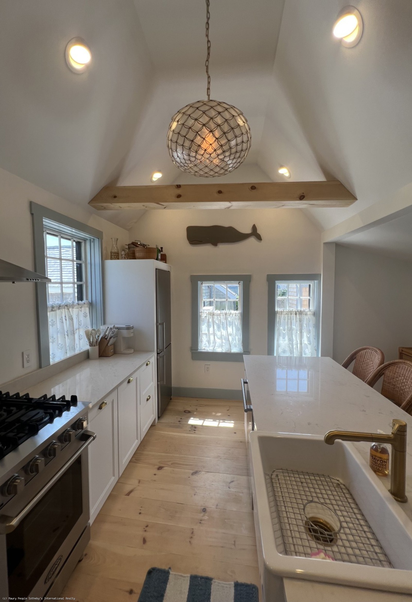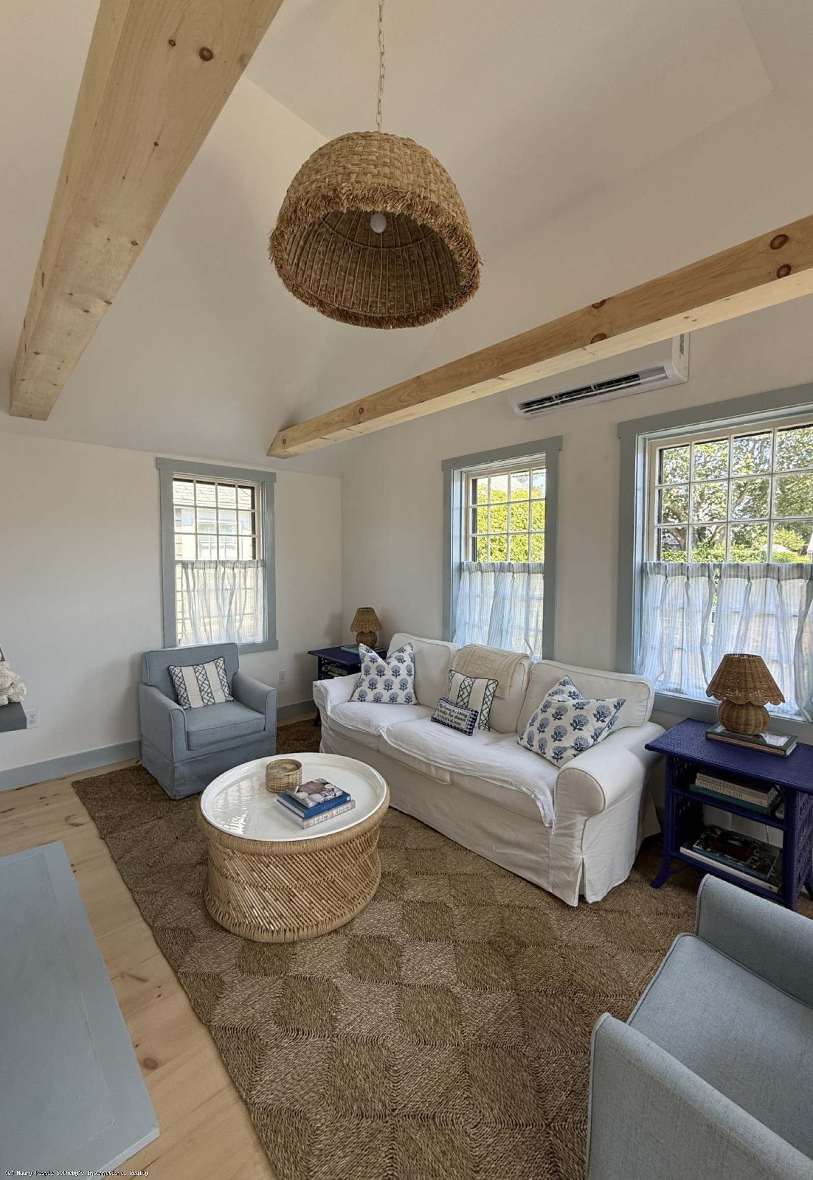 Welcome to 20 Shell Street ~ This 3 bedroom, 1 bath darling Sconset cottage is located in the heart of the village. Fully renovated for the 2025 season including all new furniture, freshly painted, split A/C & more. Newly updated white kitchen featuring vaulted ceilings with lattice detail, reclaimed wood floors, large island with farm house sink and seating (4), white quartz countertops, & 4 burner gas stove. First floor twin (2) bedroom and additional bedroom with built-in twin. Fully renovated full bath shower/tub on the first floor and stackable washer & dryer. Primary bedroom upstairs with Queen an additional twin accessible via loft (only suitable for an adult). Pack n play available for little ones. Outdoor dining, seating for 6. Front yard with parking. Just moments to the Sconset market, ice cream counter, book store, & more. Contact for more details. **Note: photos completed in spring, more accessorizing for 2025 season**