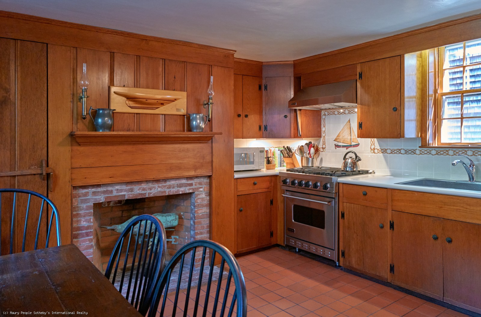 Upon entering the front hall, there is a study with a half bath. Also on the first floor, there is a queen size bedroom with a full bath. The living room is large and leads in to the dining room. The kitchen has access to a dining red brick terrace. All the rooms on the first floor have fireplaces and paneled fireplace walls.