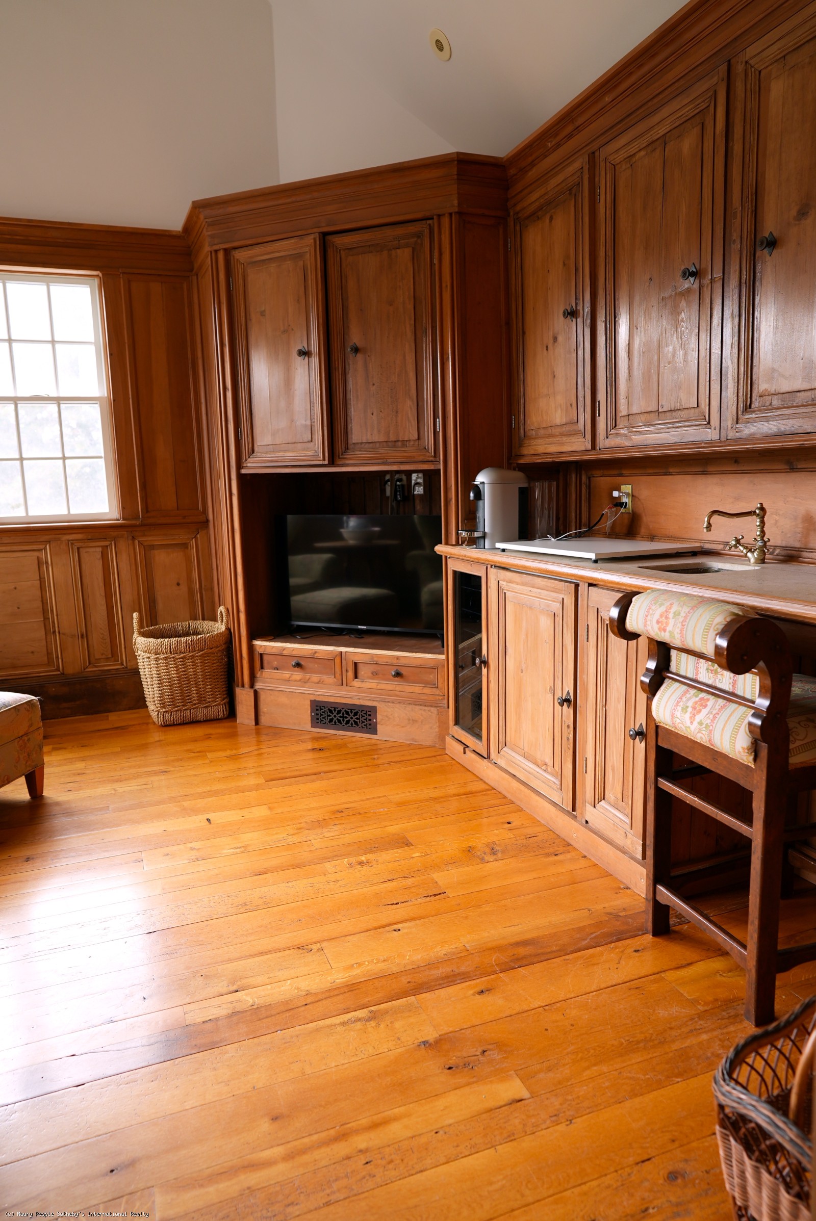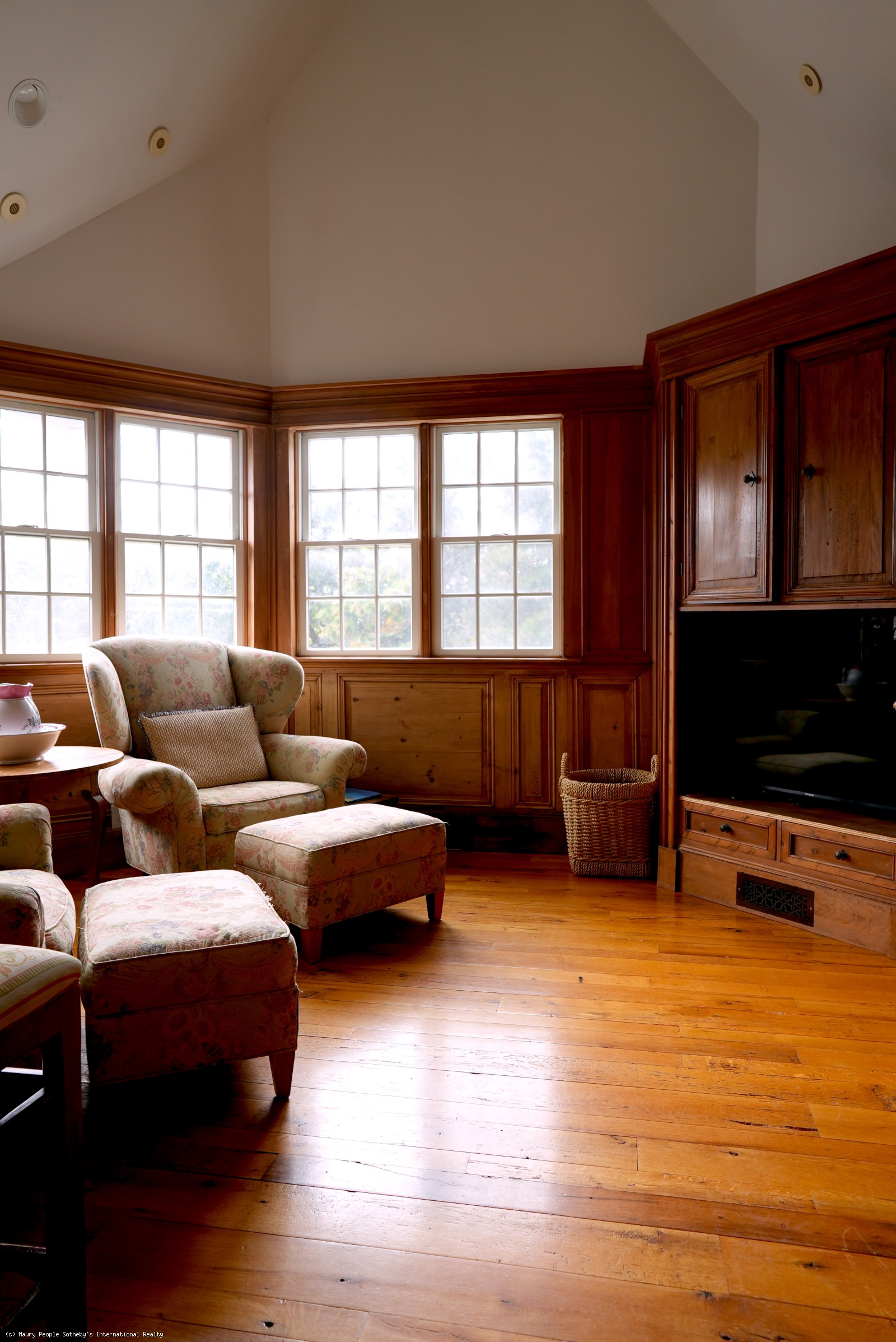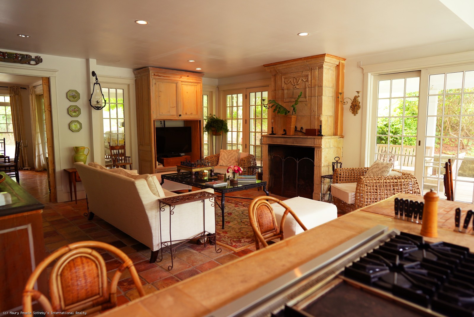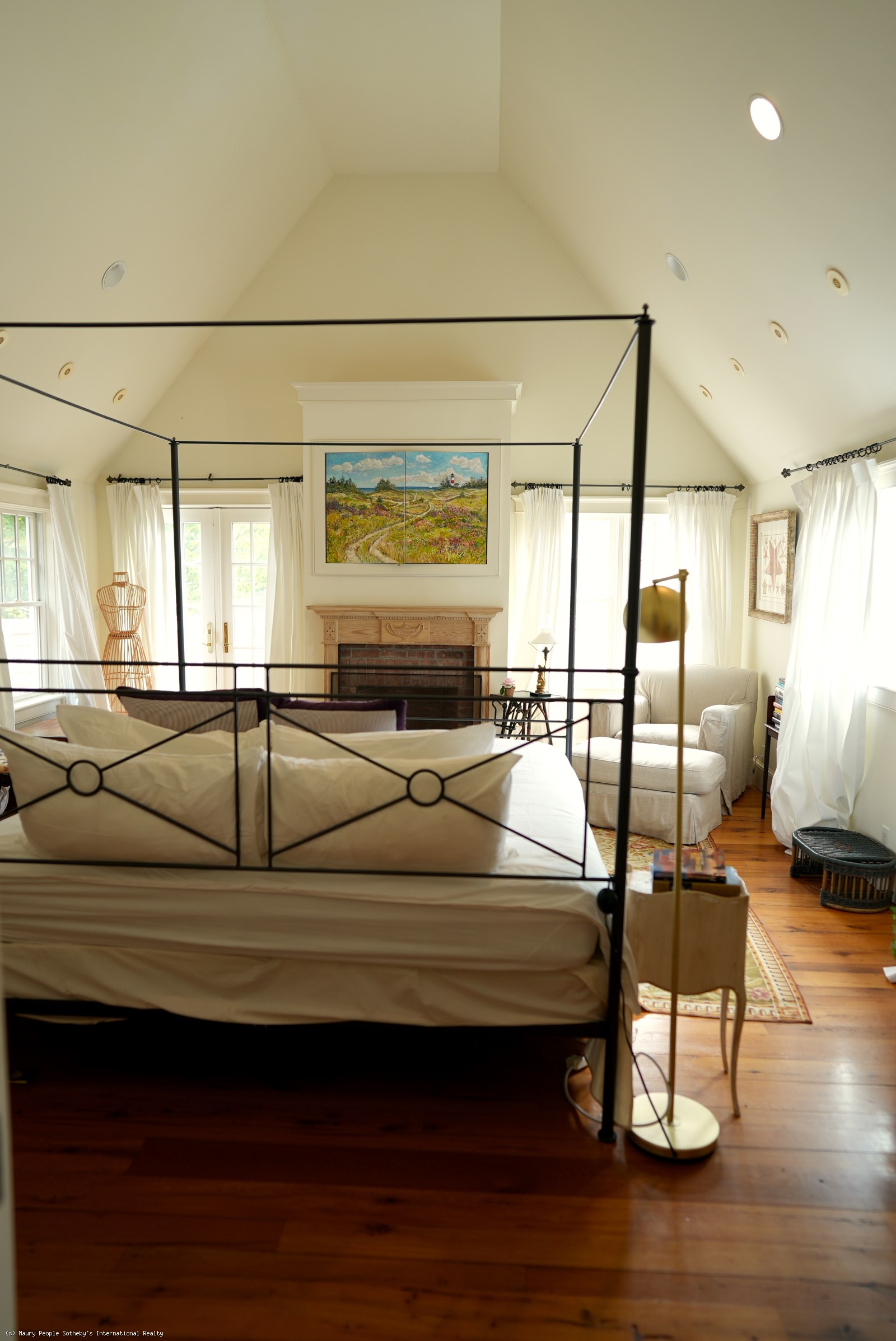 Large open foyer. Living room with fireplace and antique restored parquet floors; dining room with French doors to large covered deck with its own dining and living areas, as well as pool and gardens. State of the art kitchen/family room with French imported fireplace. Built in entertainment center. Spacious guest suite with fireplace, jacuzzi and inside and outside showers. Second floor: Expansive master bedroom suite with fireplace, private deck, and his/her walk-in closets, en suite bath with jacuzzi. Two additional bedrooms with private baths. Wood paneled library with entertainment center. Third floor: Eaved studio/office with separate walk-in wet bar and bathroom. Access to widow's walk with good town and harbor views. Lower level has a queen suite with living room, full bath and separate entrance.
