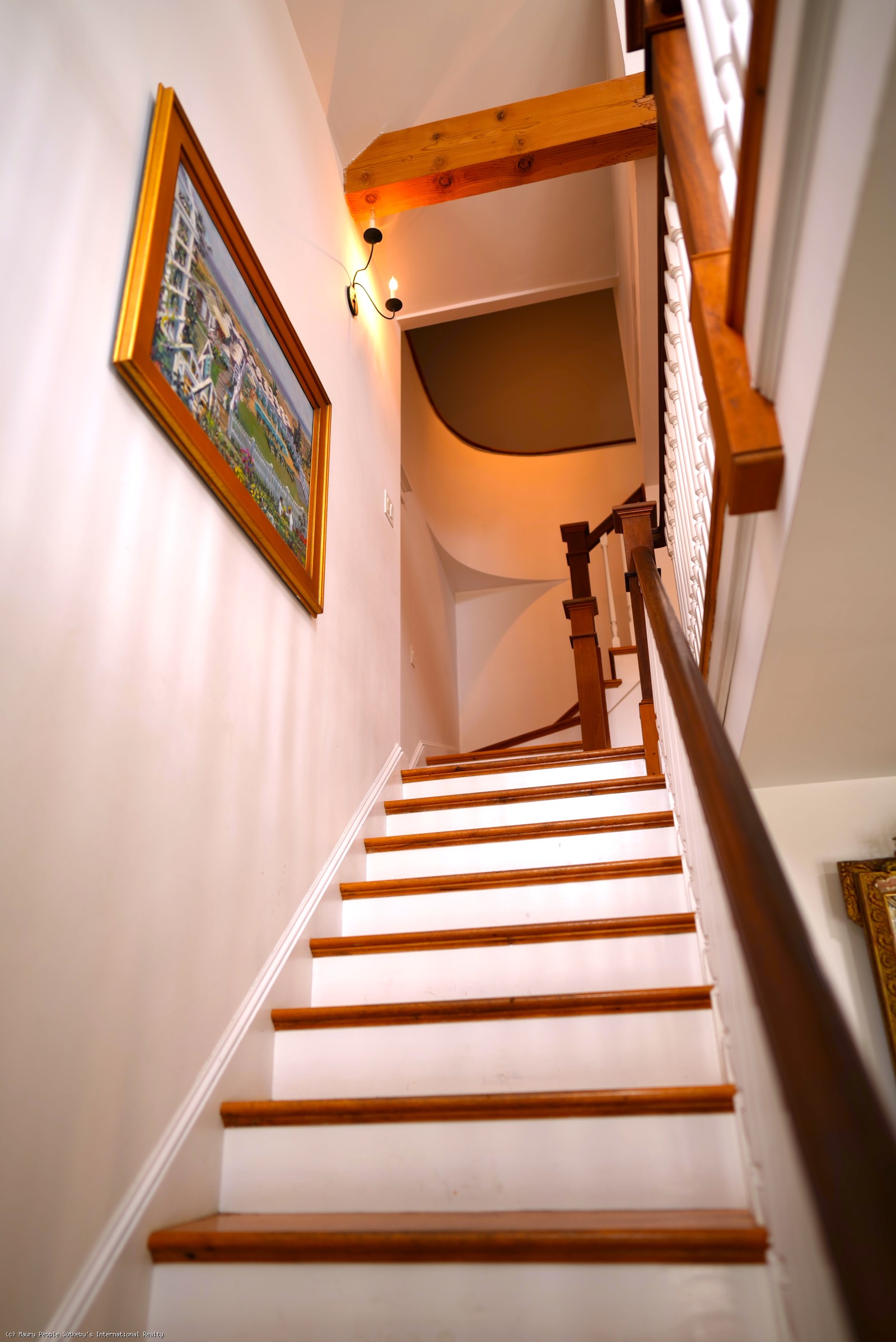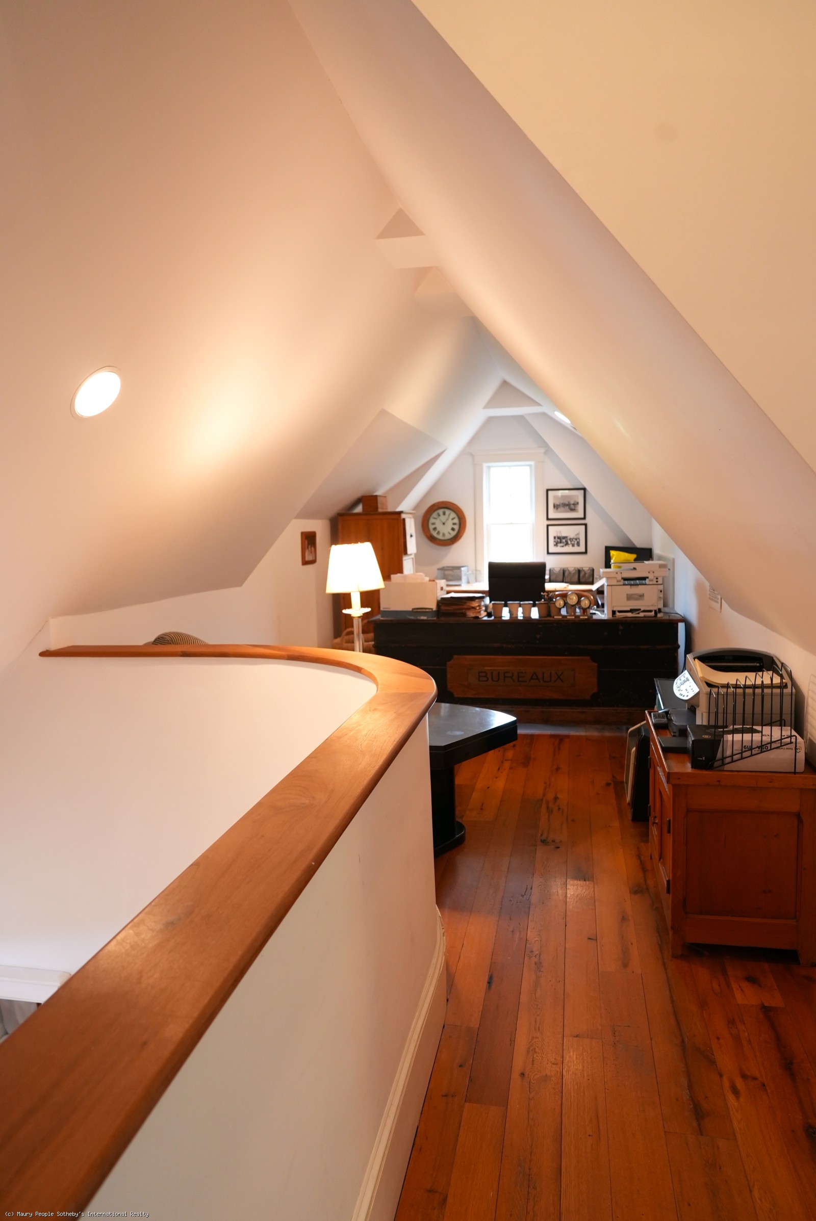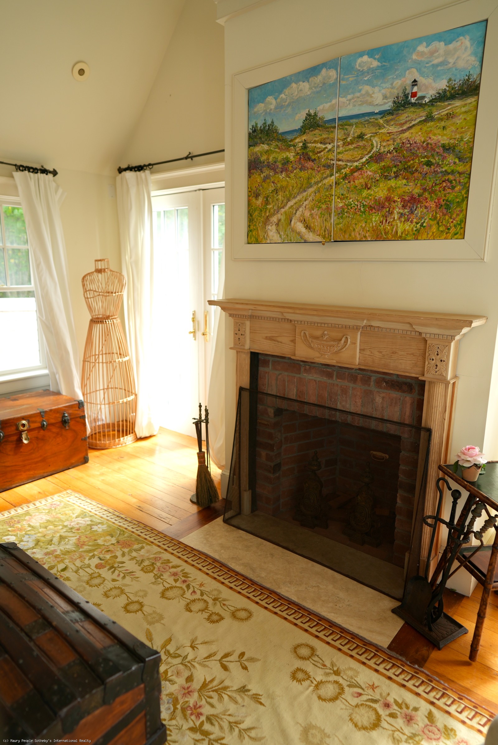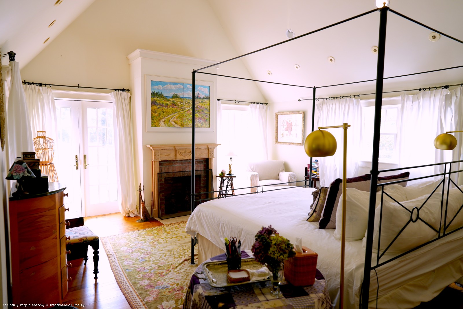 Large open foyer. Living room with fireplace and antique restored parquet floors; dining room with French doors to large covered deck with its own dining and living areas, as well as pool and gardens. State of the art kitchen/family room with French imported fireplace. Built in entertainment center. Spacious guest suite with fireplace, jacuzzi and inside and outside showers. Second floor: Expansive master bedroom suite with fireplace, private deck, and his/her walk-in closets, en suite bath with jacuzzi. Two additional bedrooms with private baths. Wood paneled library with entertainment center. Third floor: Eaved studio/office with separate walk-in wet bar and bathroom. Access to widow's walk with good town and harbor views. Lower level has a queen suite with living room, full bath and separate entrance.