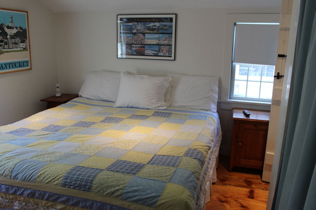 Classic Sconset bungalow right in the center of town with a large yard with gardens, an outdoor brick grill, fish pond and outdoor patio set for 6, and one off street parking place. First Floor Description Galley kitchen with island and directors chairs for dining. Living room with high speed internet and flat screen TV. Stacked washer and dryer in the kitchen. Full bathroom with shower. Master bedroom with TV and full bathroom with tub Second floor has two guest rooms each with two twin beds.