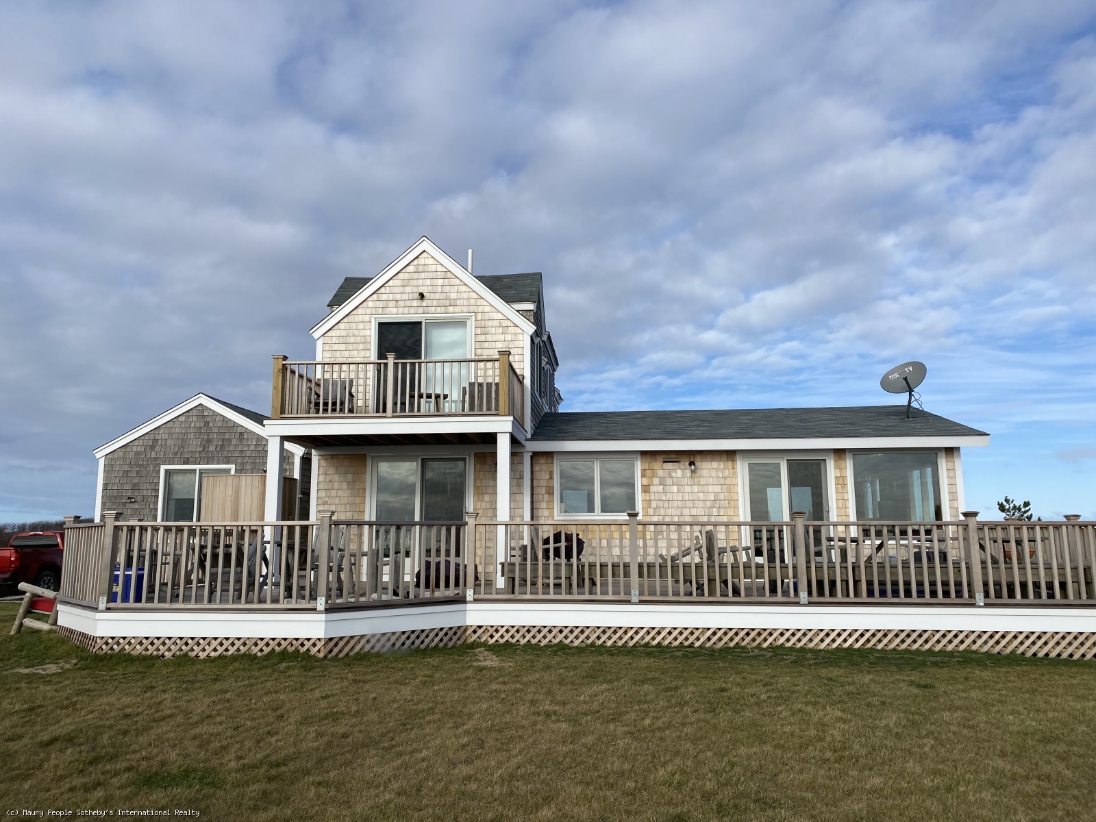 A fantastic six bedroom oceanfront beach house with stairs to one of the best beaches on Nantucket Island! This South Shore beach house has recently added a lower level with a new living room, two guest bedrooms and a laundry room. Enjoy spectacular ocean views from many rooms through the beach house. The spacious, light-filled, open floor plan hosts a kitchen with gas range, living and dining areas all facing the ocean for breathtaking ocean views. The dining area opens to a large, open deck overlooking the ocean, with two outdoor dinings areas and two sitting areas. A second floor primary suite (queen) with private bath and office area, private deck offering sweeping views of the ocean. First floor offers four guest bedrooms each with queen beds, two of the guest rooms have sliders to the deck for outstanding ocean views. There are two full hall baths for the four guest bedrooms.