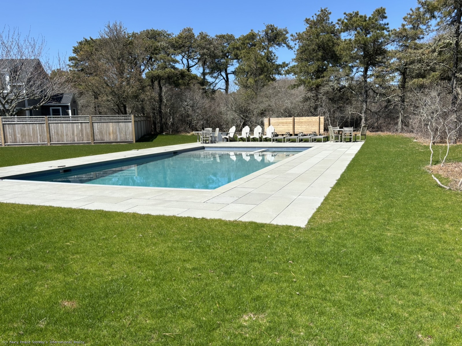 Outside find a nicely landscaped yard with pool, patio, and ample space for lounging and dining.