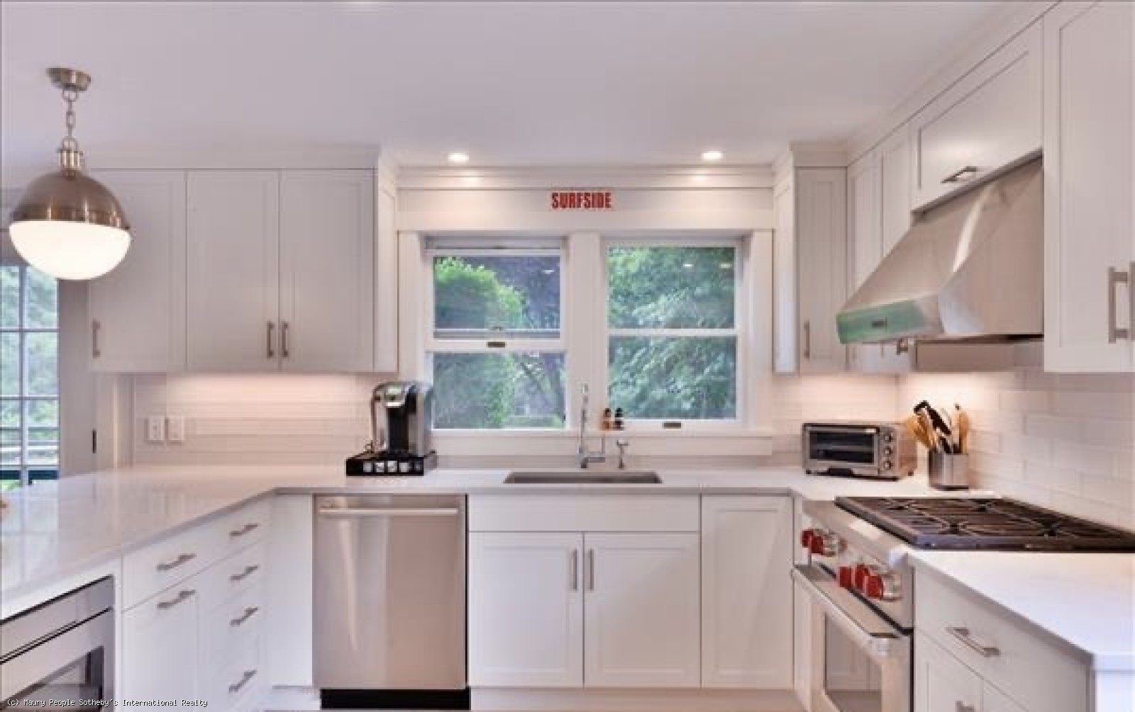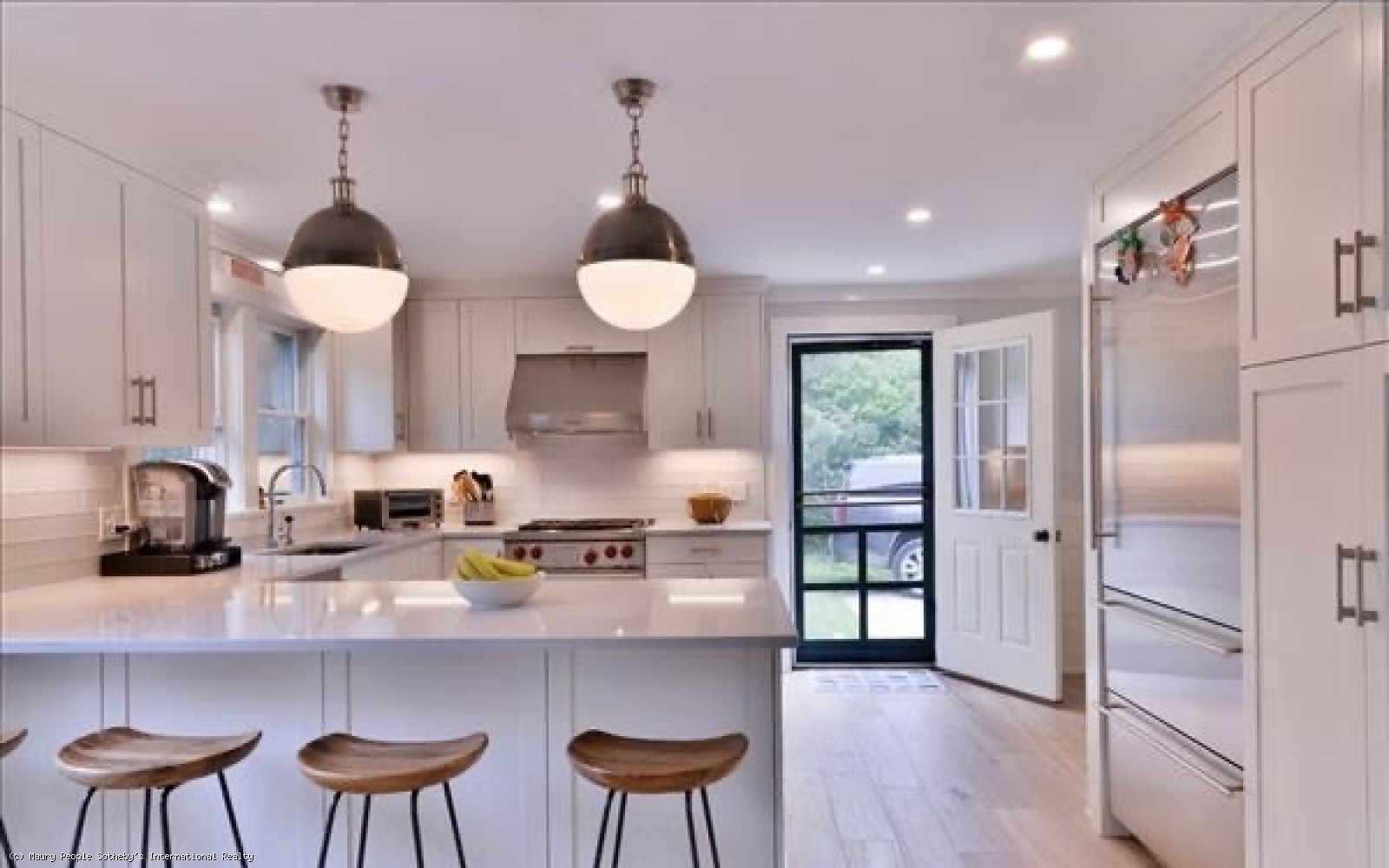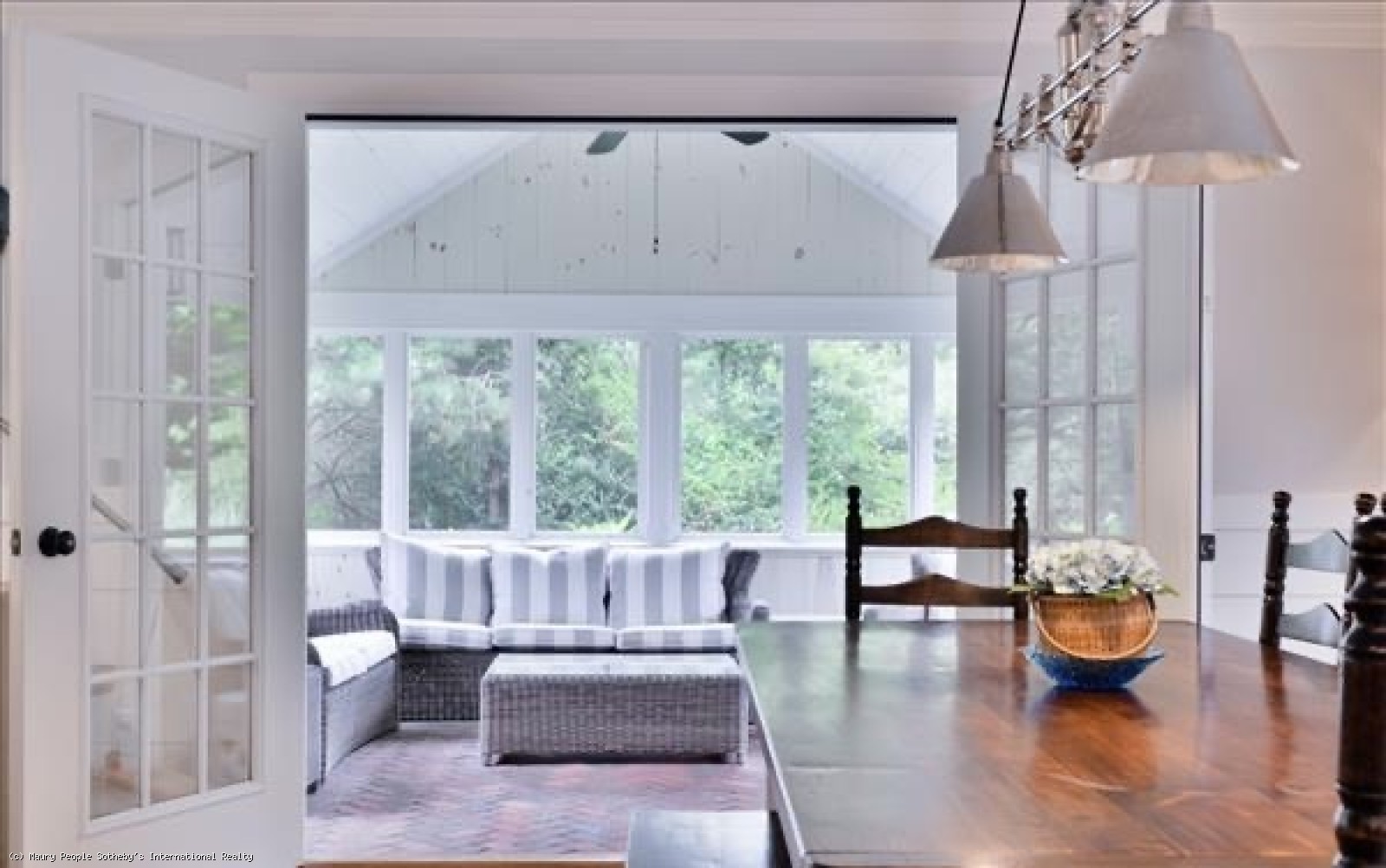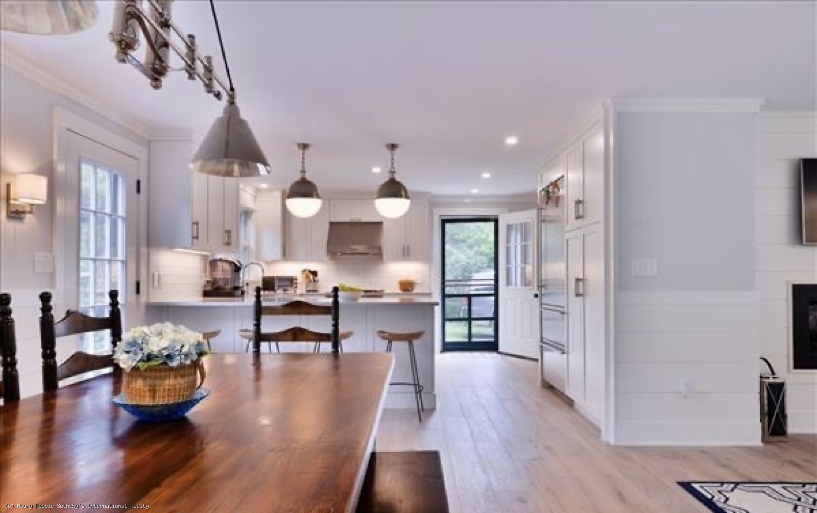 The first floor is an open living area with modern kitchen, dining for eight, sunroom, and half bath.