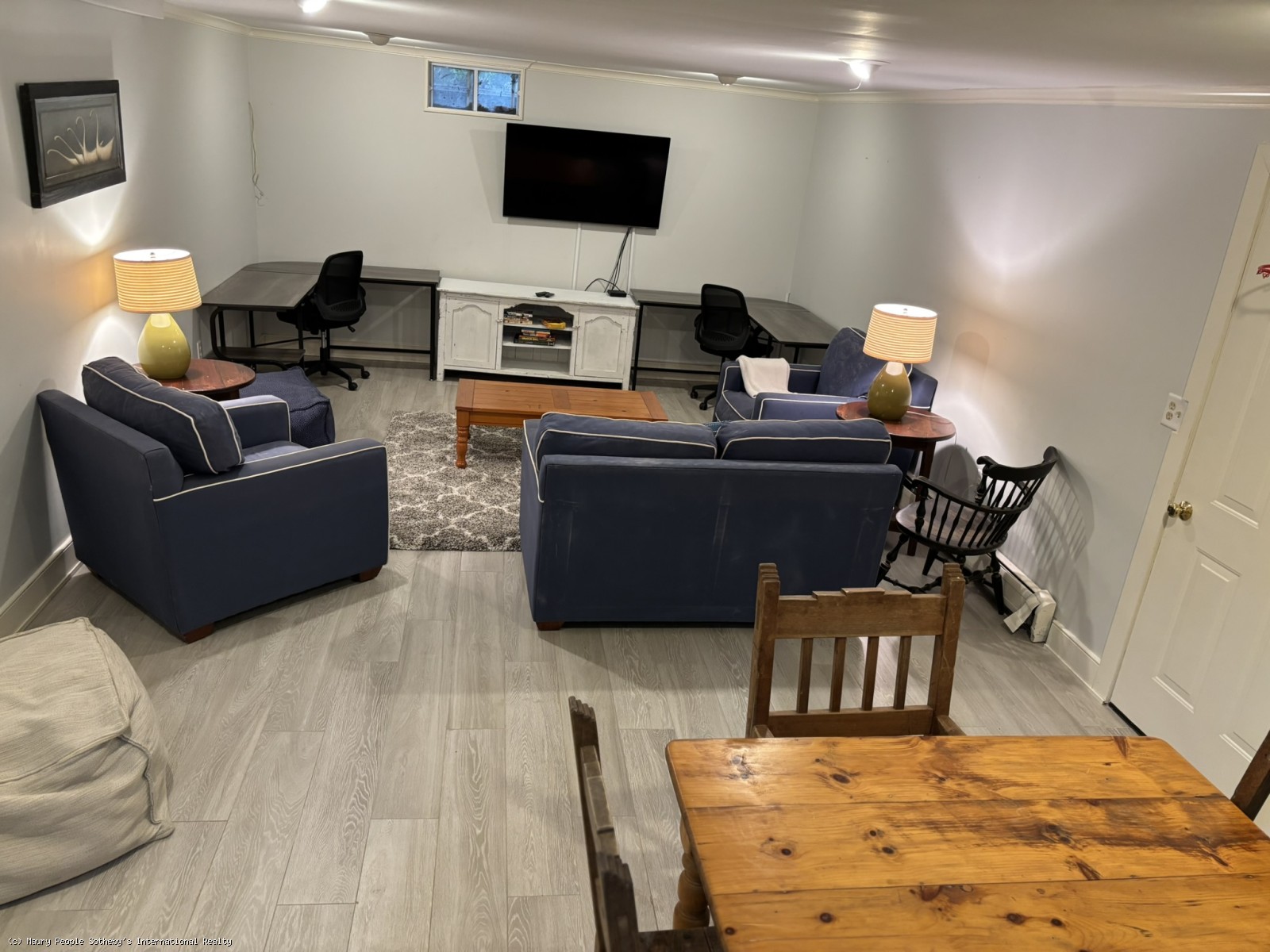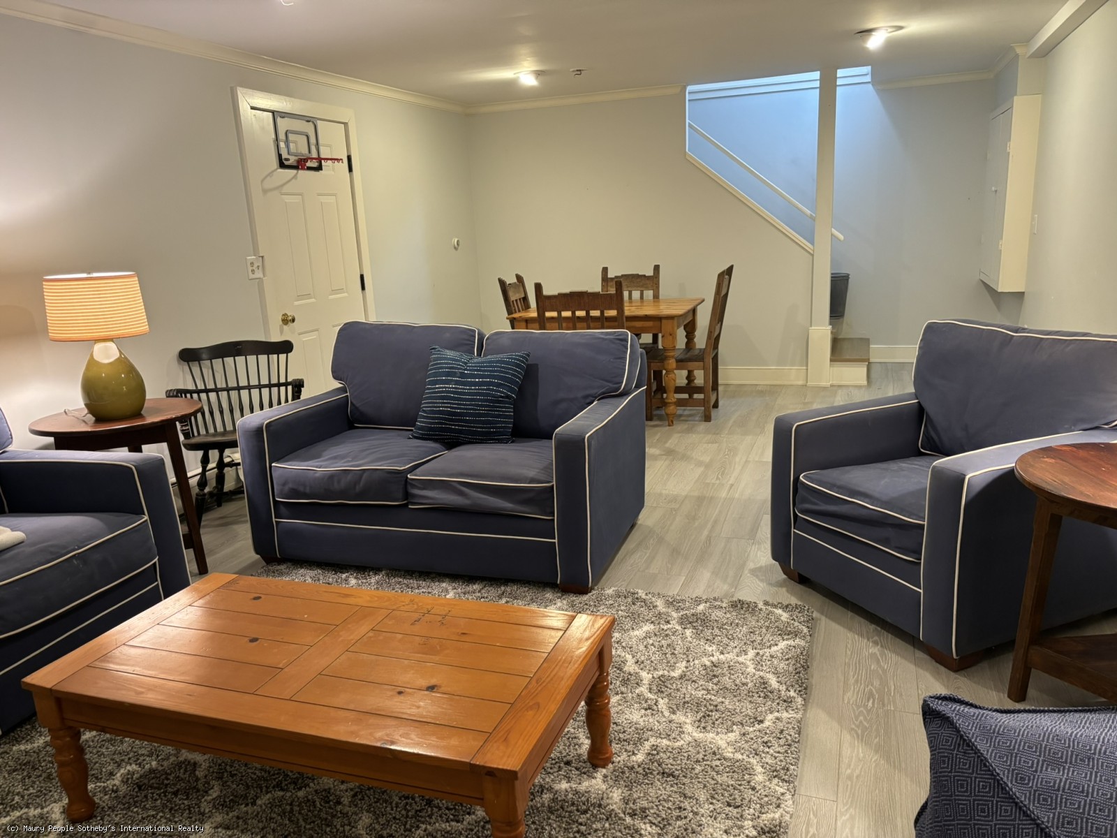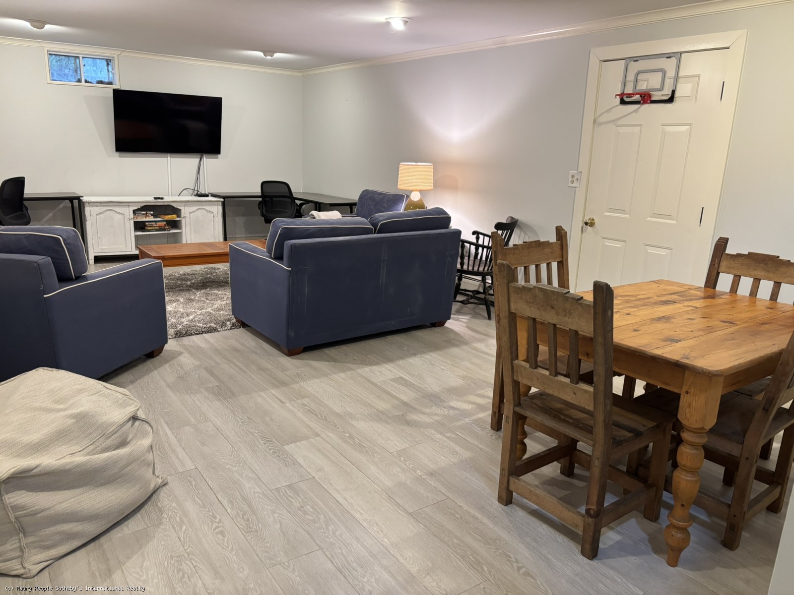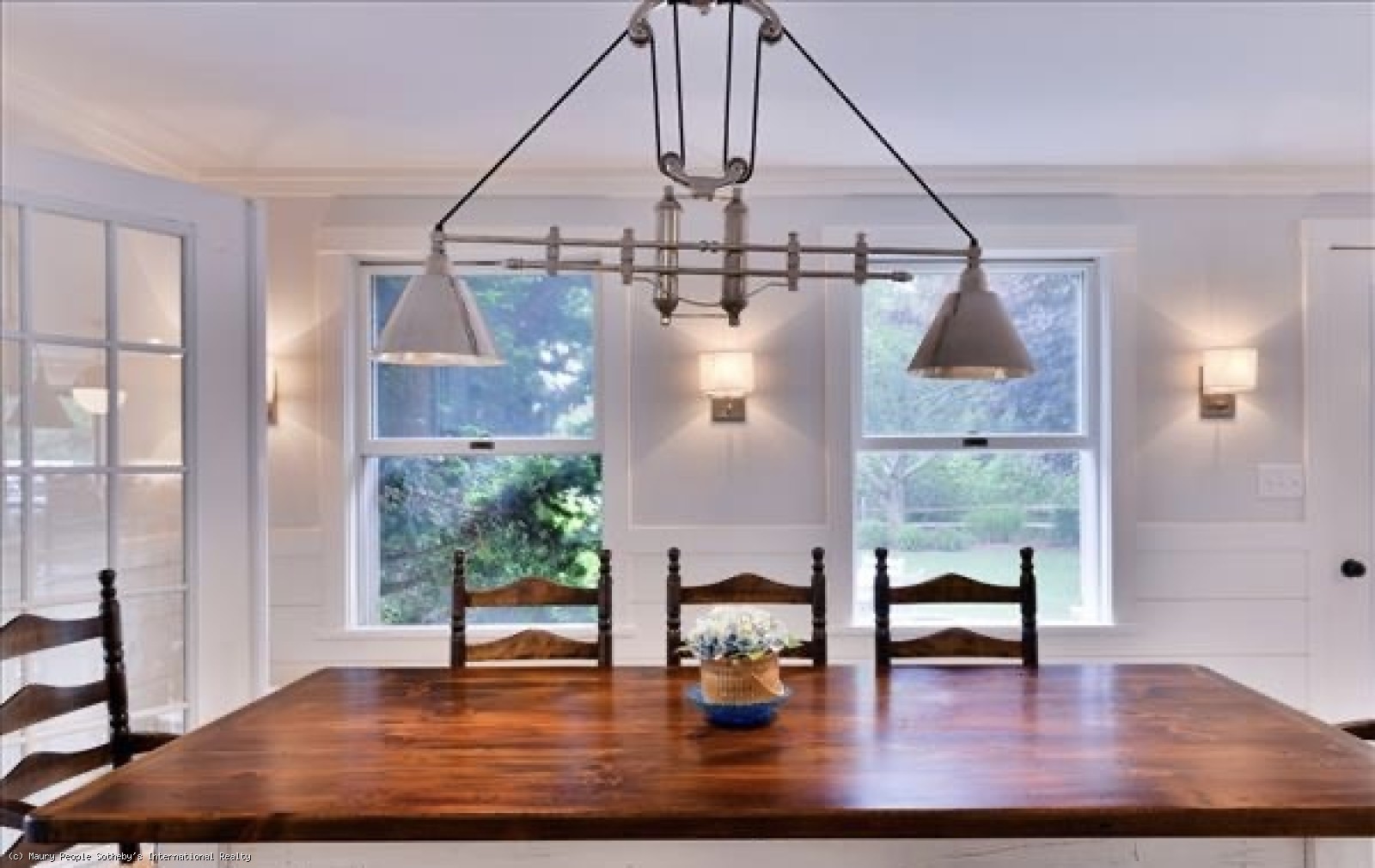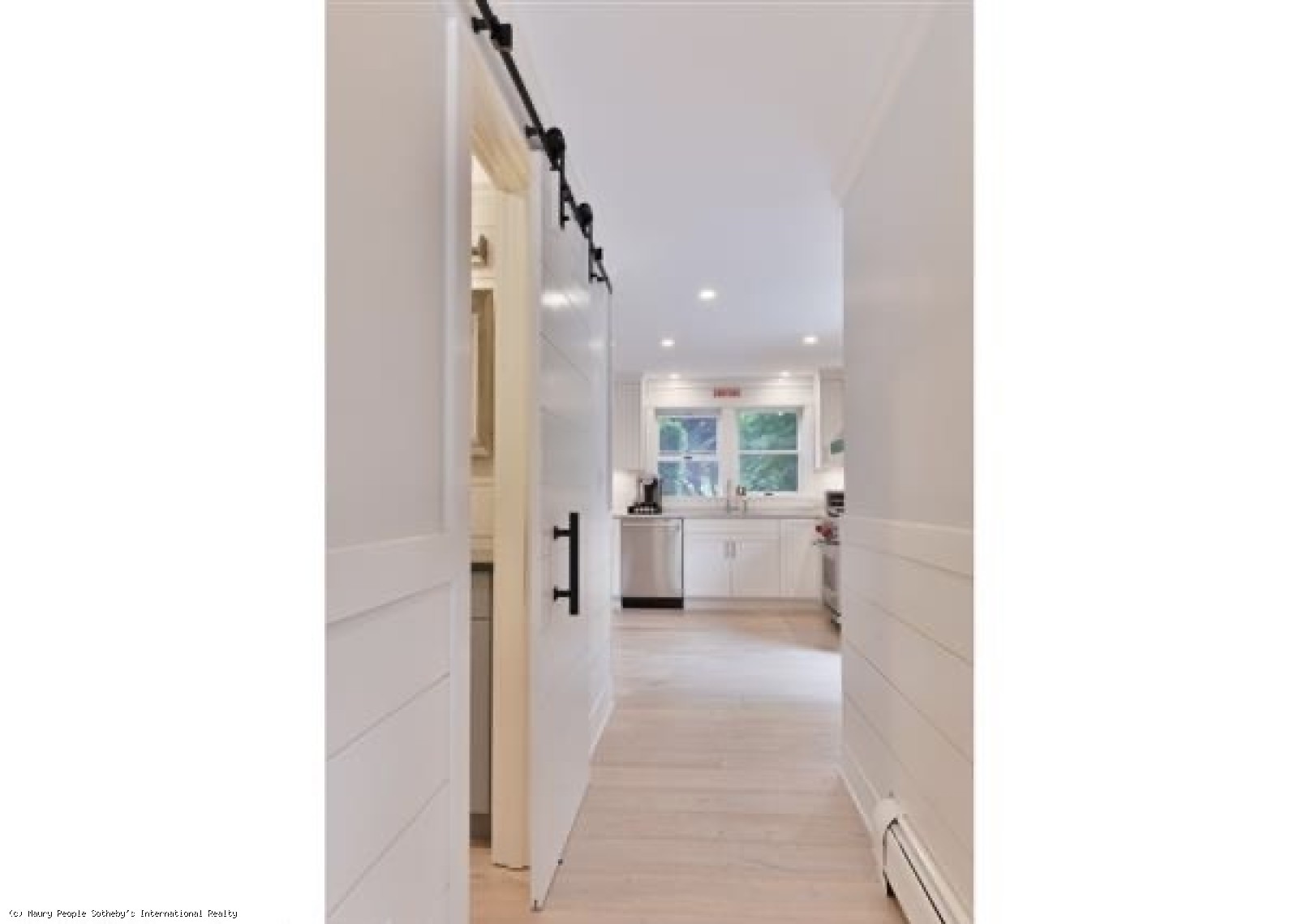 The first floor is an open living area with modern kitchen, dining for eight, sunroom, and half bath.