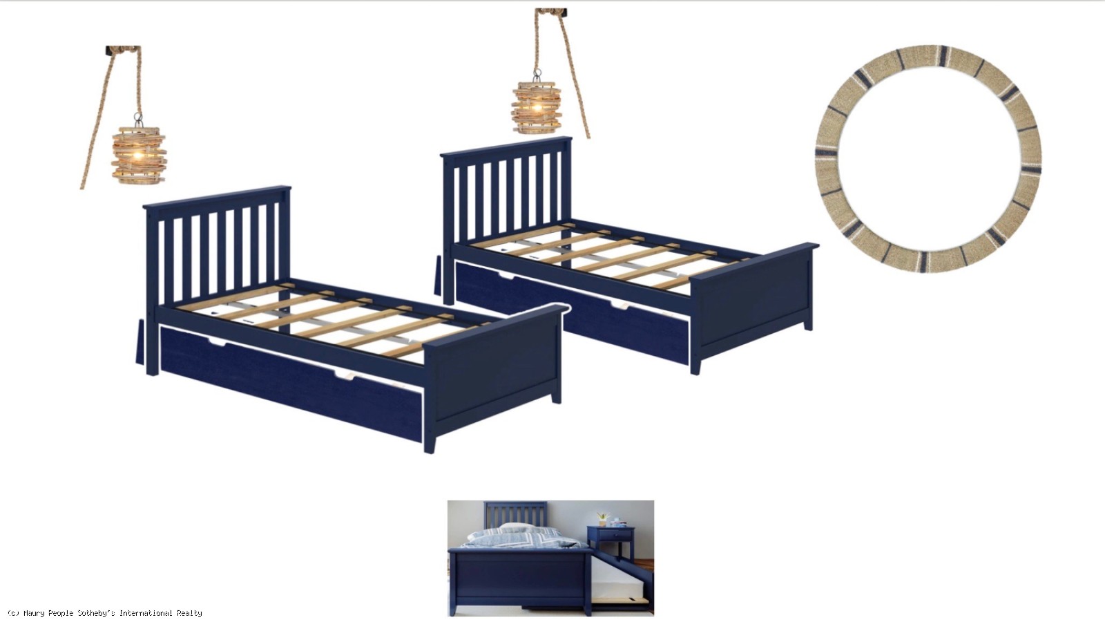 Upstairs, the primary suite features a king bed and a private bath with double vanities and an elegant, spa-style shower. Two additional bedrooms are also on this level: one with a queen bed and another with two twins, each with a trundle bed to accommodate four people. These rooms share a full hall bath with a tub and shower.