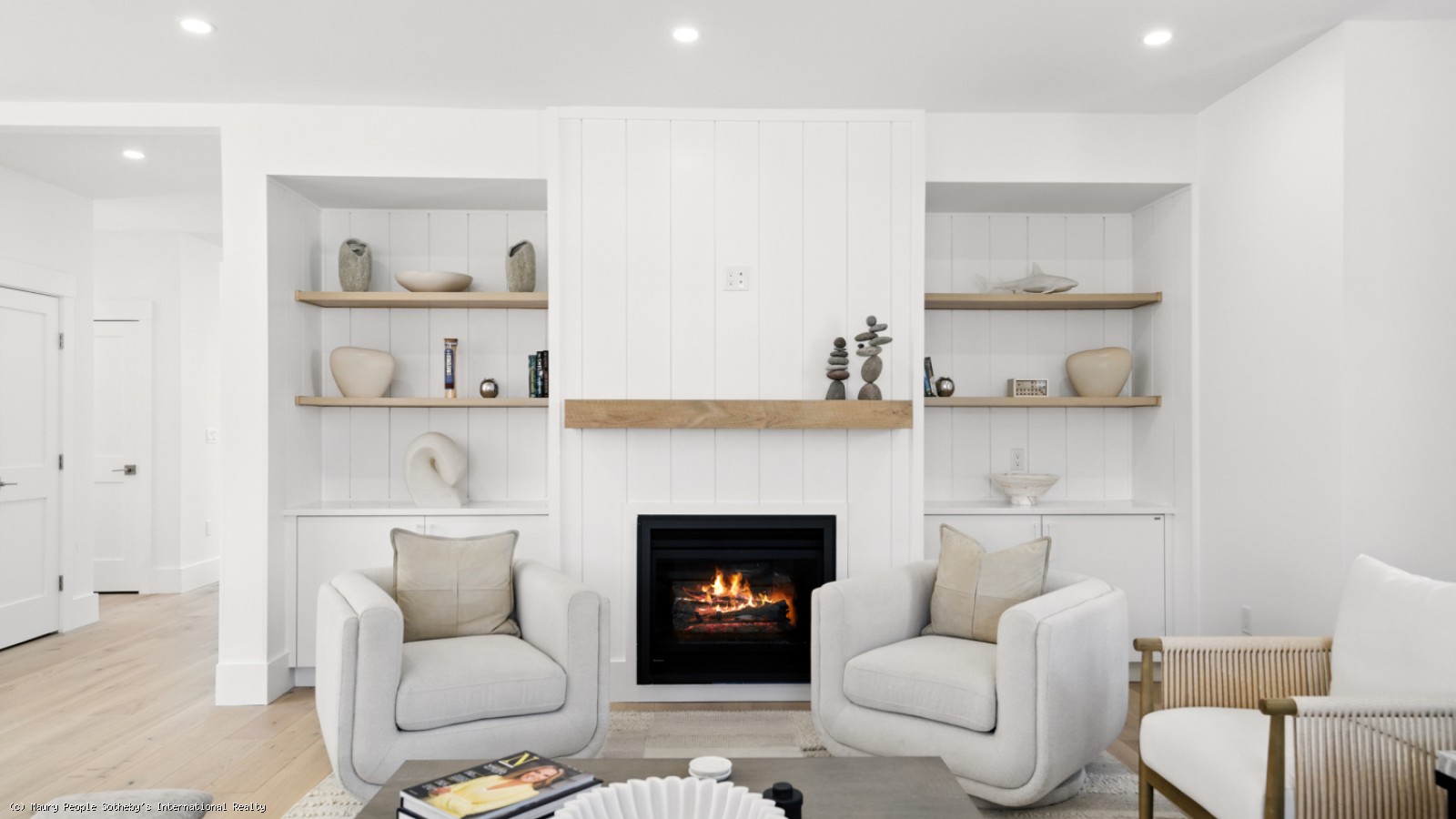 The main living level is designed for easy entertaining and relaxed family living. The kitchen is the focal point, centered around a large island with seating for five and fully outfitted for cooking and gathering. The adjoining living room is spacious and welcoming, with a gas fireplace and a large flat-screen TV. A side entry leads directly to the bluestone patio with outdoor dining area, making indoor-outdoor living seamless. This level also includes a bright dining room with seating for eight, a mudroom with laundry, and a convenient full bathroom.