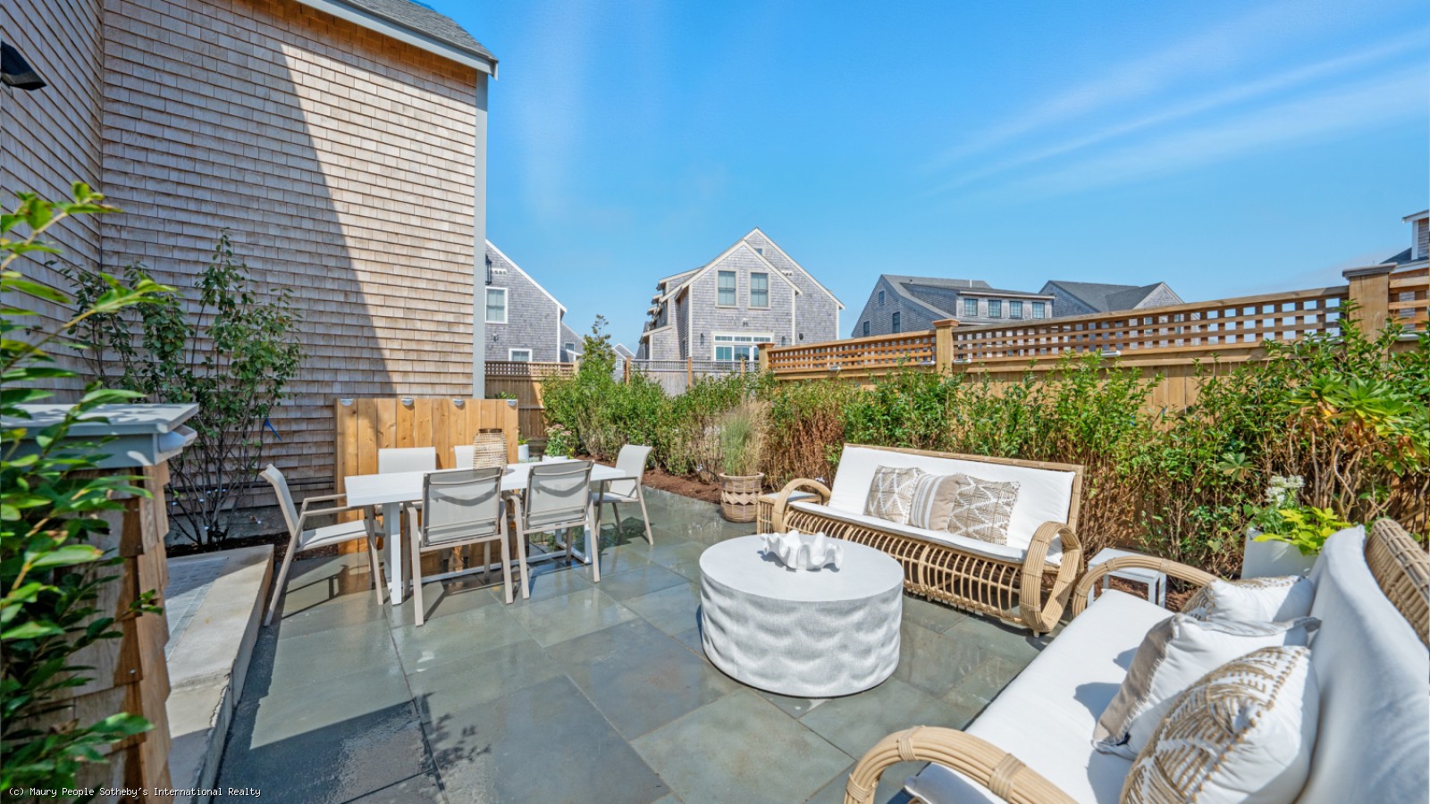 Outside, enjoy a bluestone patio with a dining area and an outdoor shower. The private yard provides space for both relaxing and casual outdoor meals.