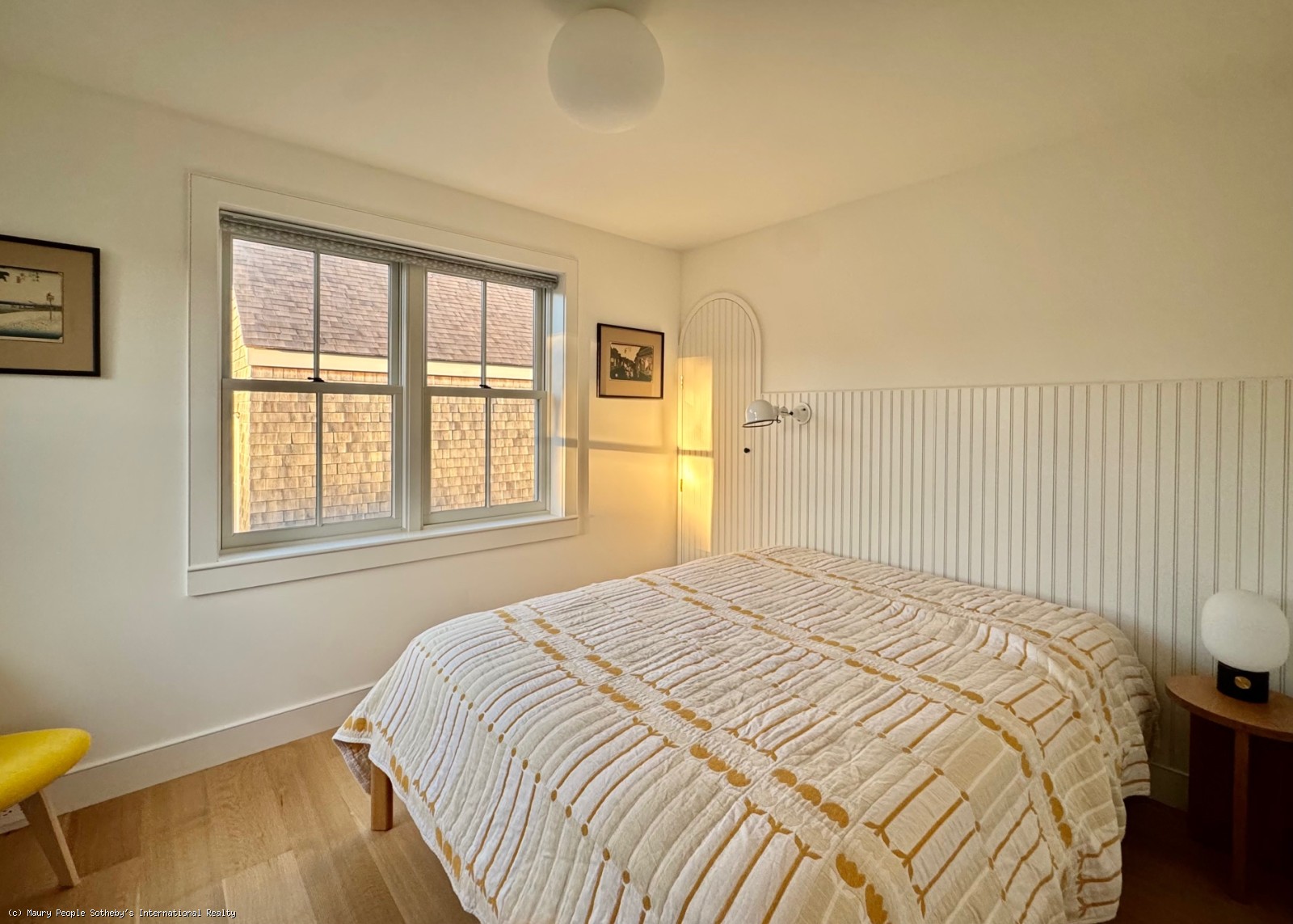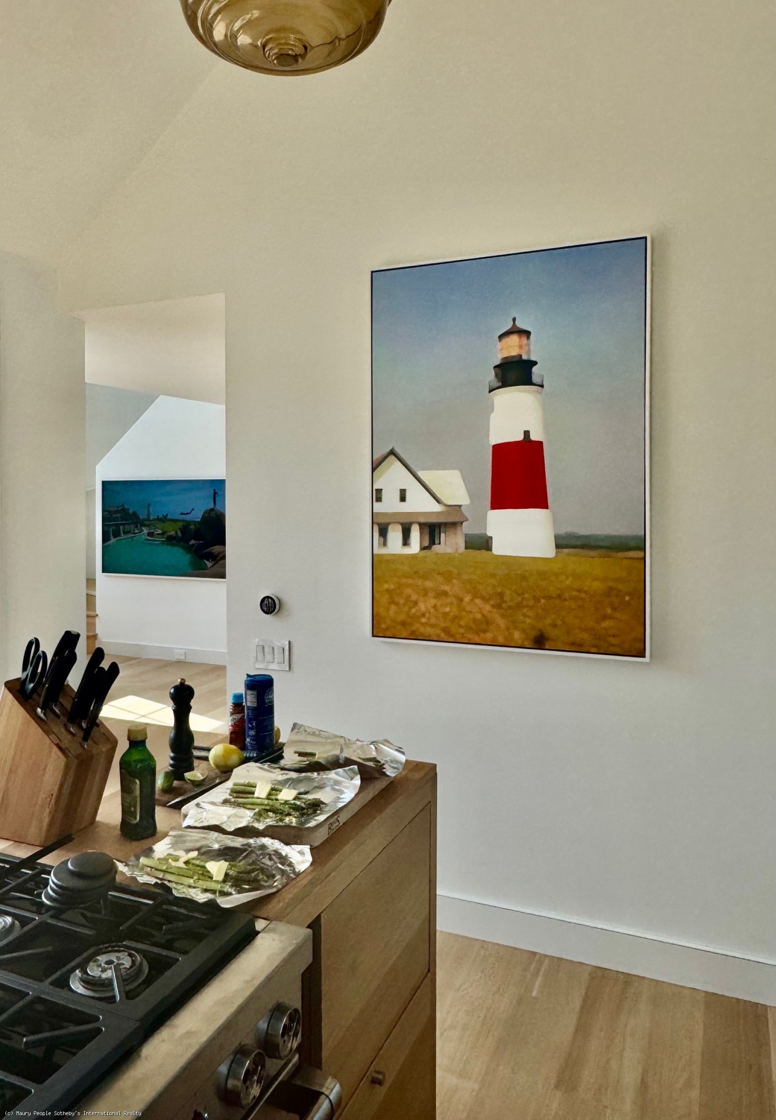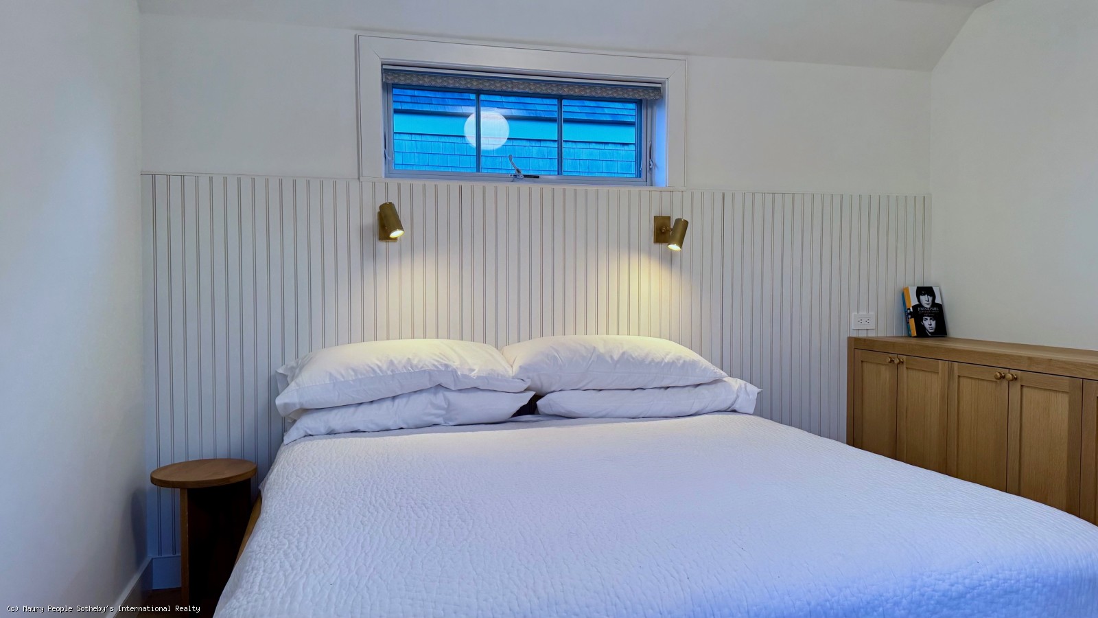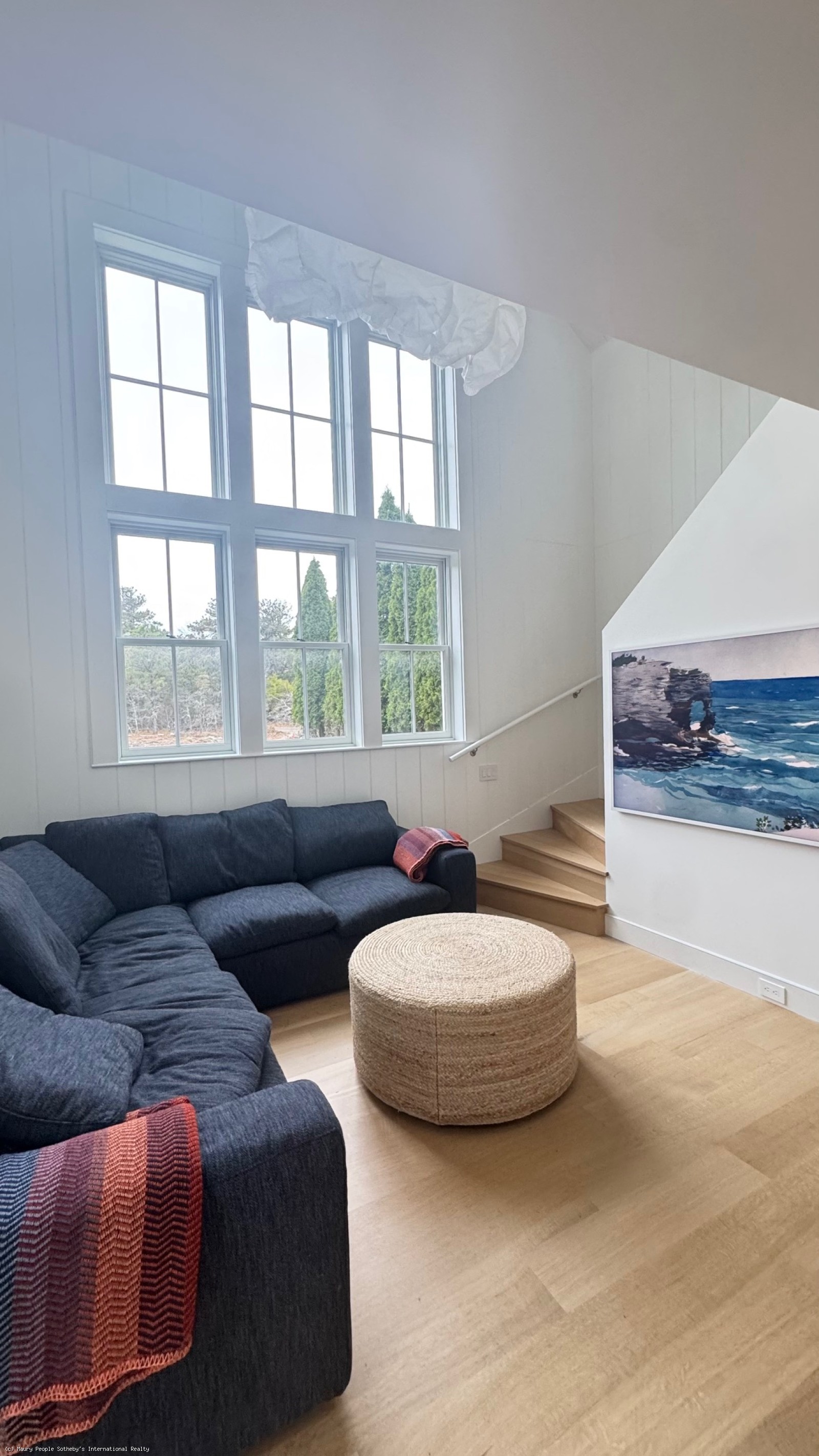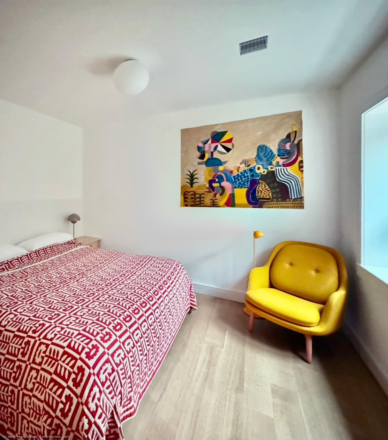 The South stair leads to a gallery displaying vintage island art and original watercolors. At one end is a king bedroom with built-ins; at the other, a queen bedroom with 55" Frame TV, and windows open to the distant sound of surf. Between them, the shared bath is divided into two rooms: one with toilet and sink, and another with a skylit tub/shower, and custom oak vanity.