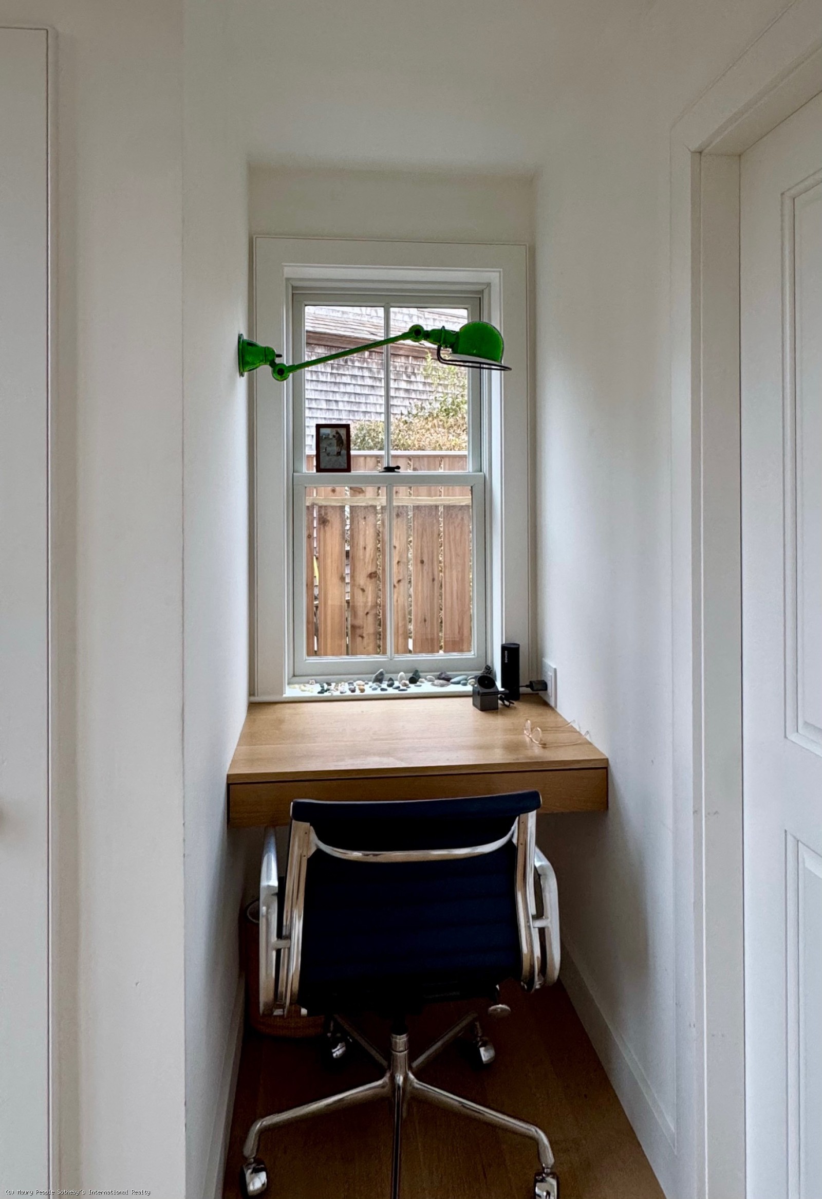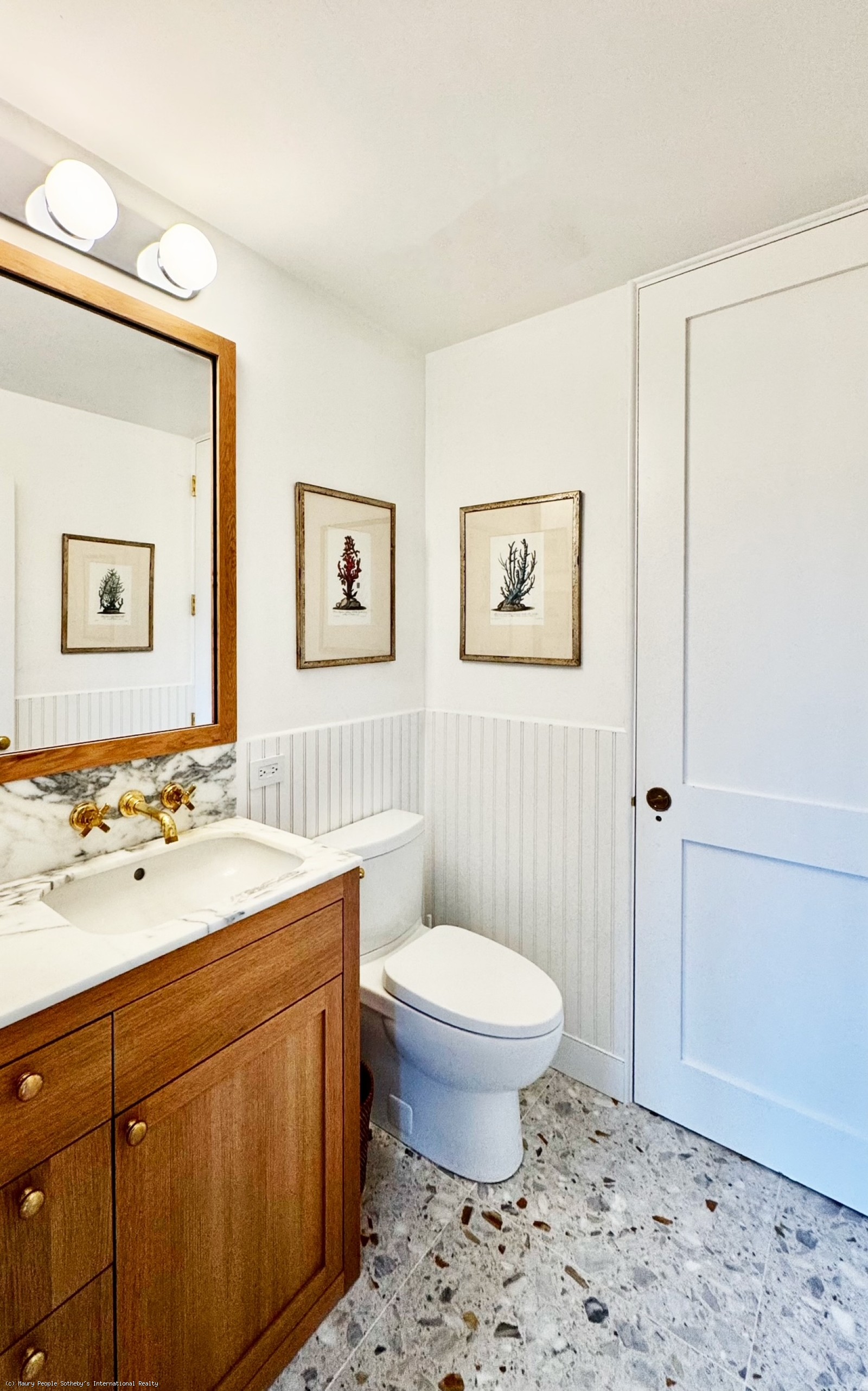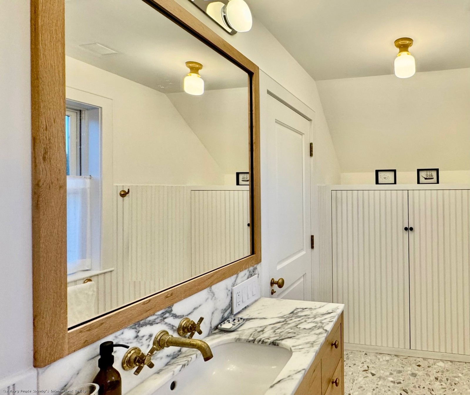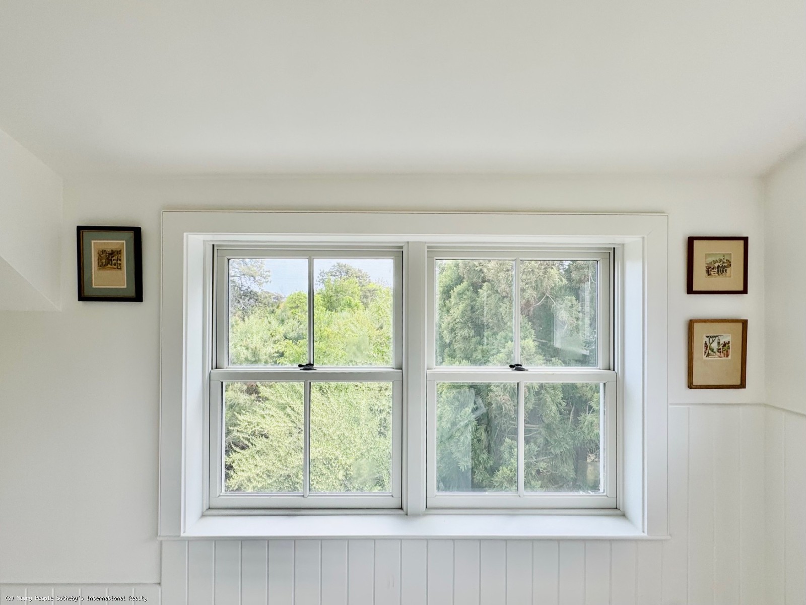 The South stair leads to a gallery displaying vintage island art and original watercolors. At one end is a king bedroom with built-ins; at the other, a queen bedroom with 55" Frame TV, and windows open to the distant sound of surf. Between them, the shared bath is divided into two rooms: one with toilet and sink, and another with a skylit tub/shower, and custom oak vanity.