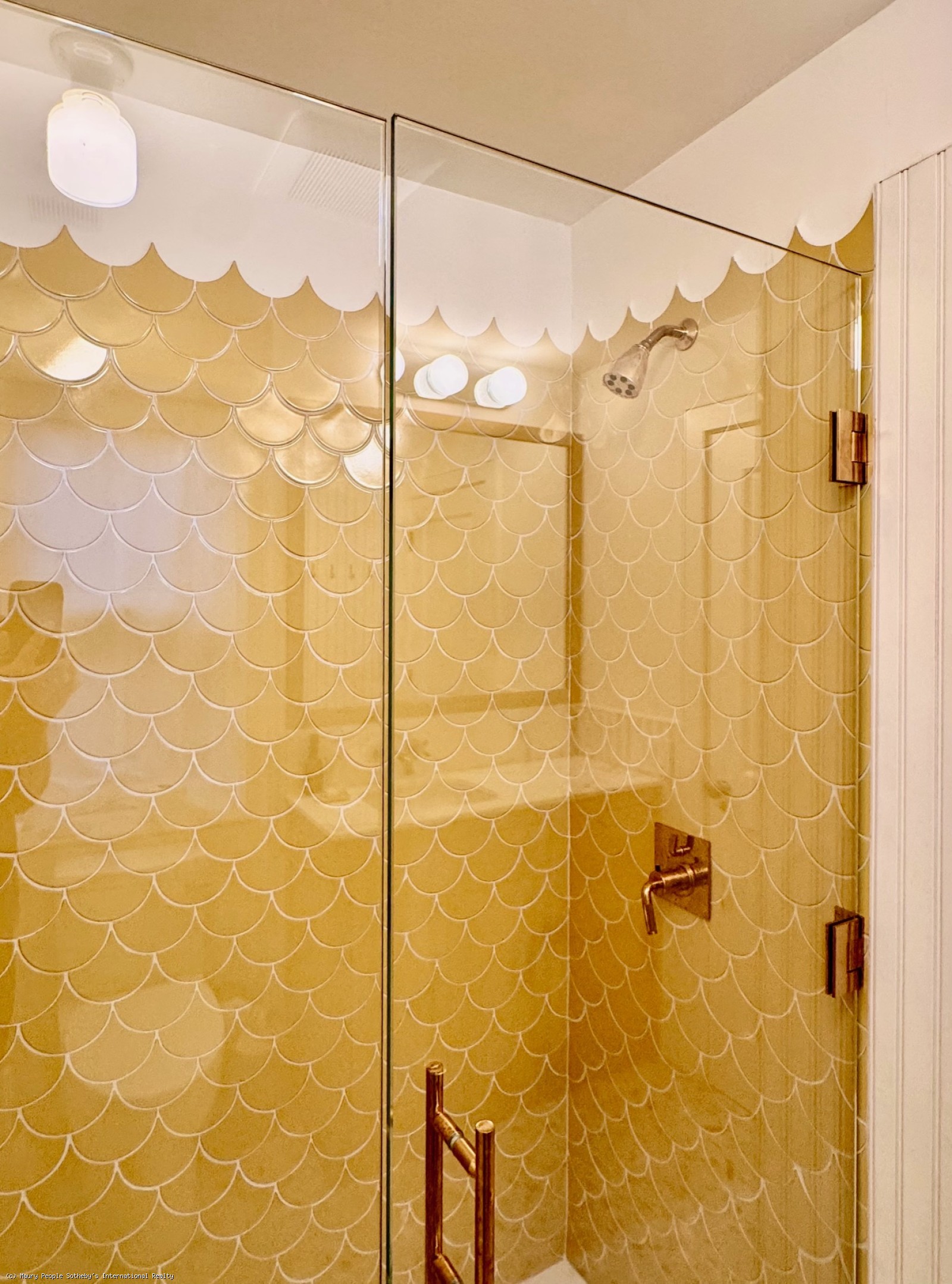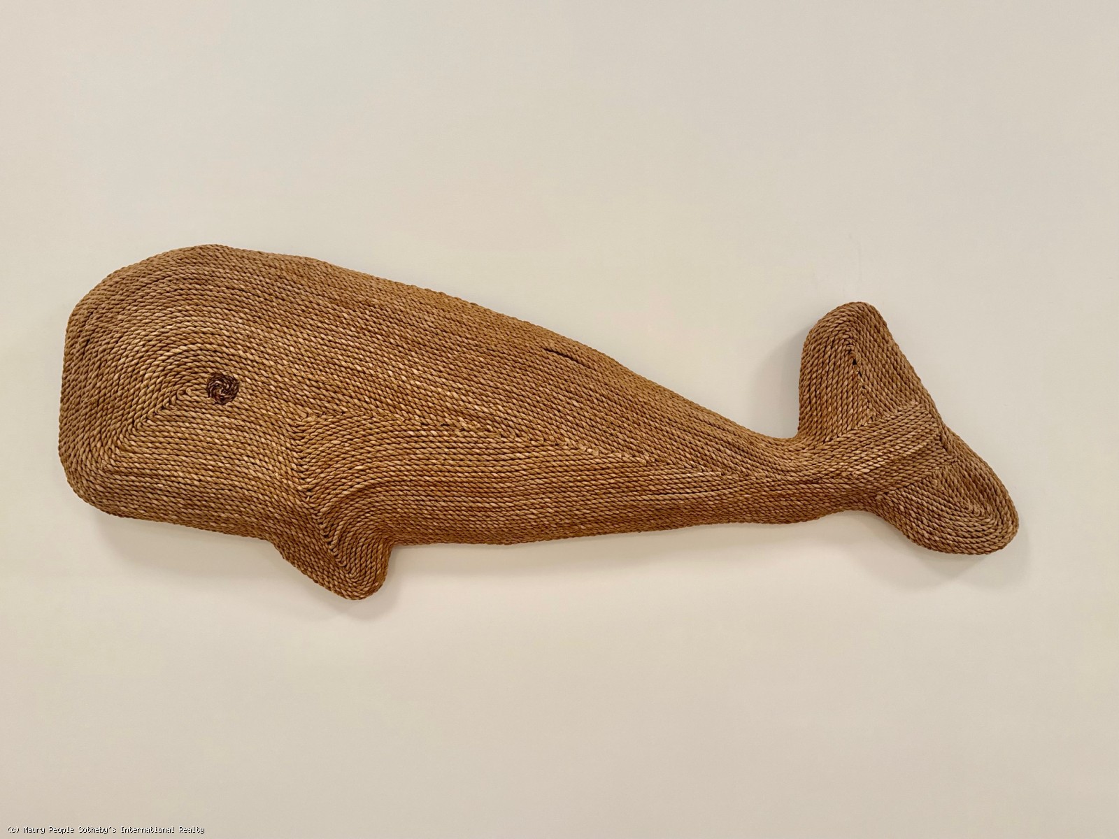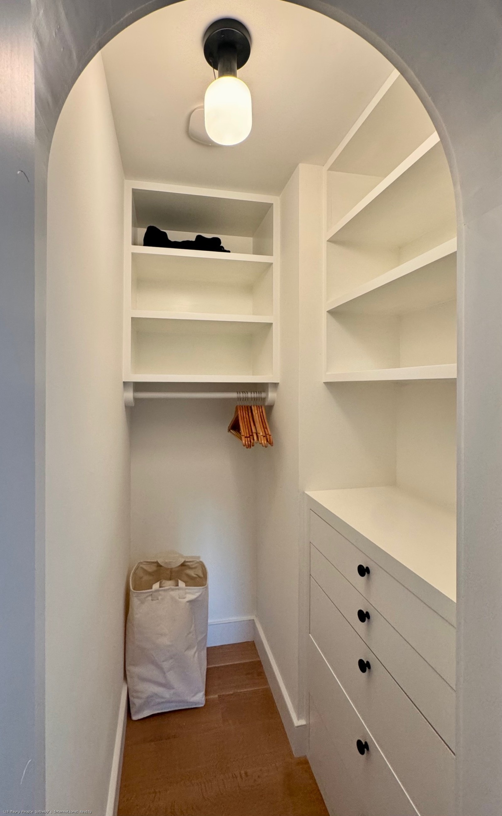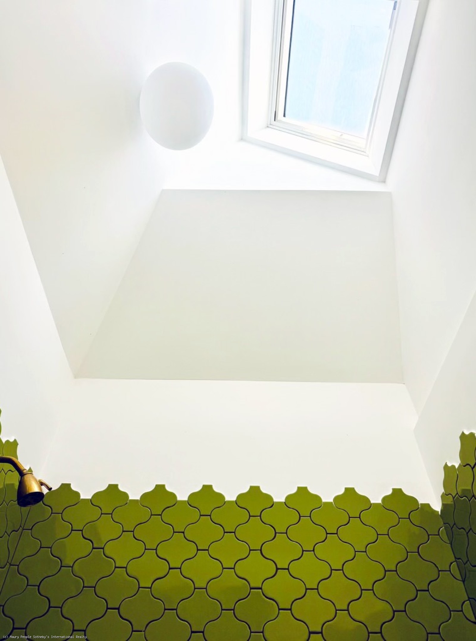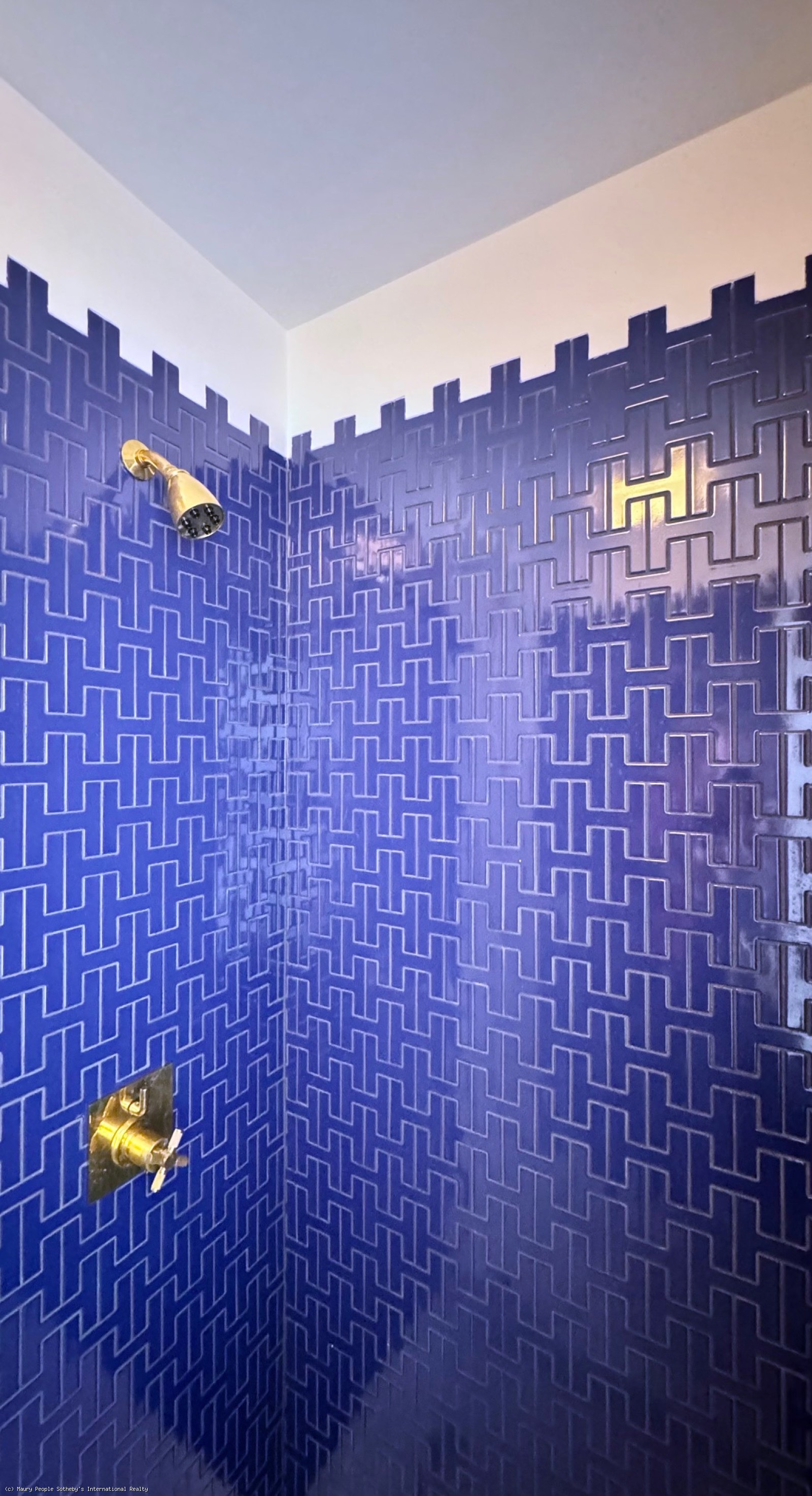 The South stair leads to a gallery displaying vintage island art and original watercolors. At one end is a king bedroom with built-ins; at the other, a queen bedroom with 55" Frame TV, and windows open to the distant sound of surf. Between them, the shared bath is divided into two rooms: one with toilet and sink, and another with a skylit tub/shower, and custom oak vanity.