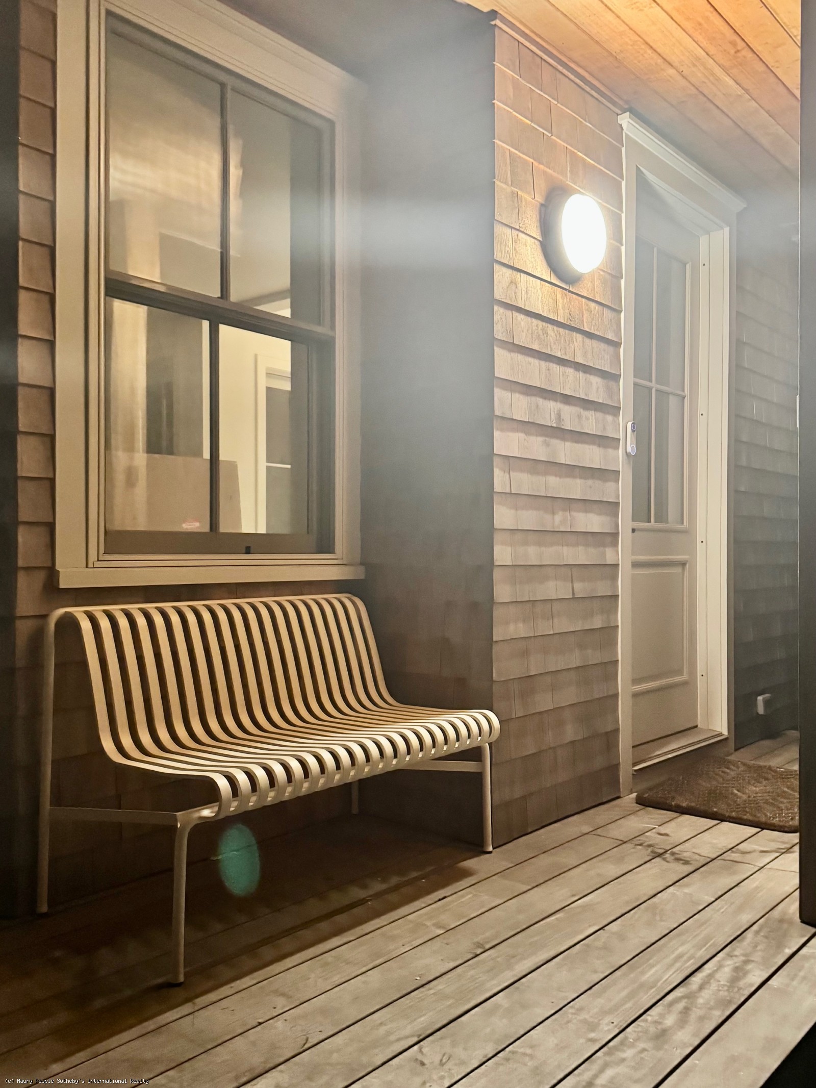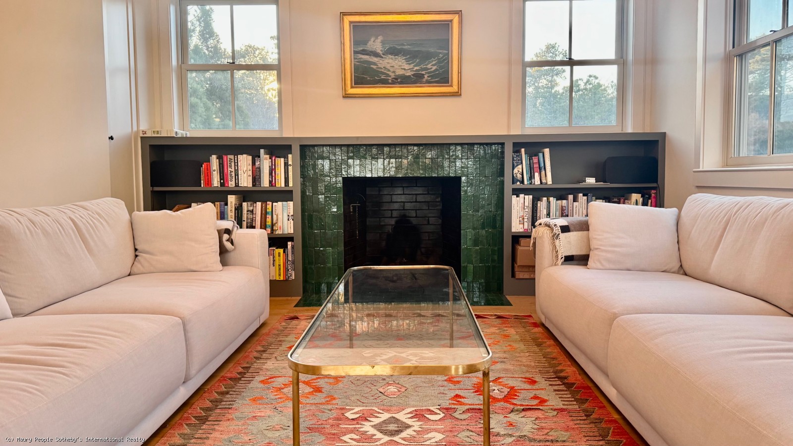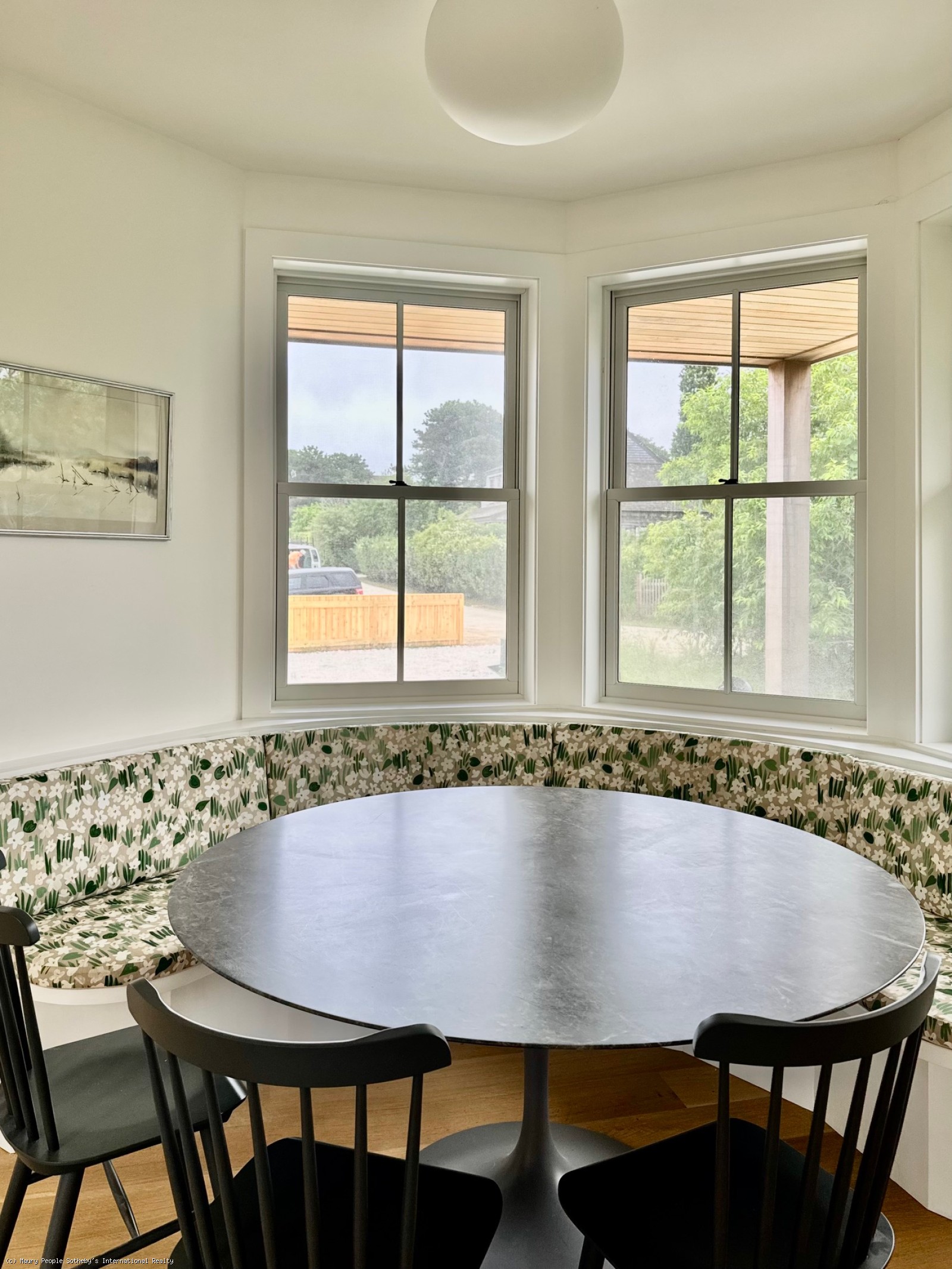 Entry is through a covered porch into a practical hall with hooks for coats and space for shoes. From here, the dining area and living room open directly ahead. The dining area seats 8-10 and flows into a bright living room furnished with two 10 foot RH sofas. Built in bookshelves flank the fireplace. A Saarinen tulip table adapts easily to different group sizes, paired with an upholstered semicircular banquette and Windsor chairs. creates a cozy and comfortable dining area.
