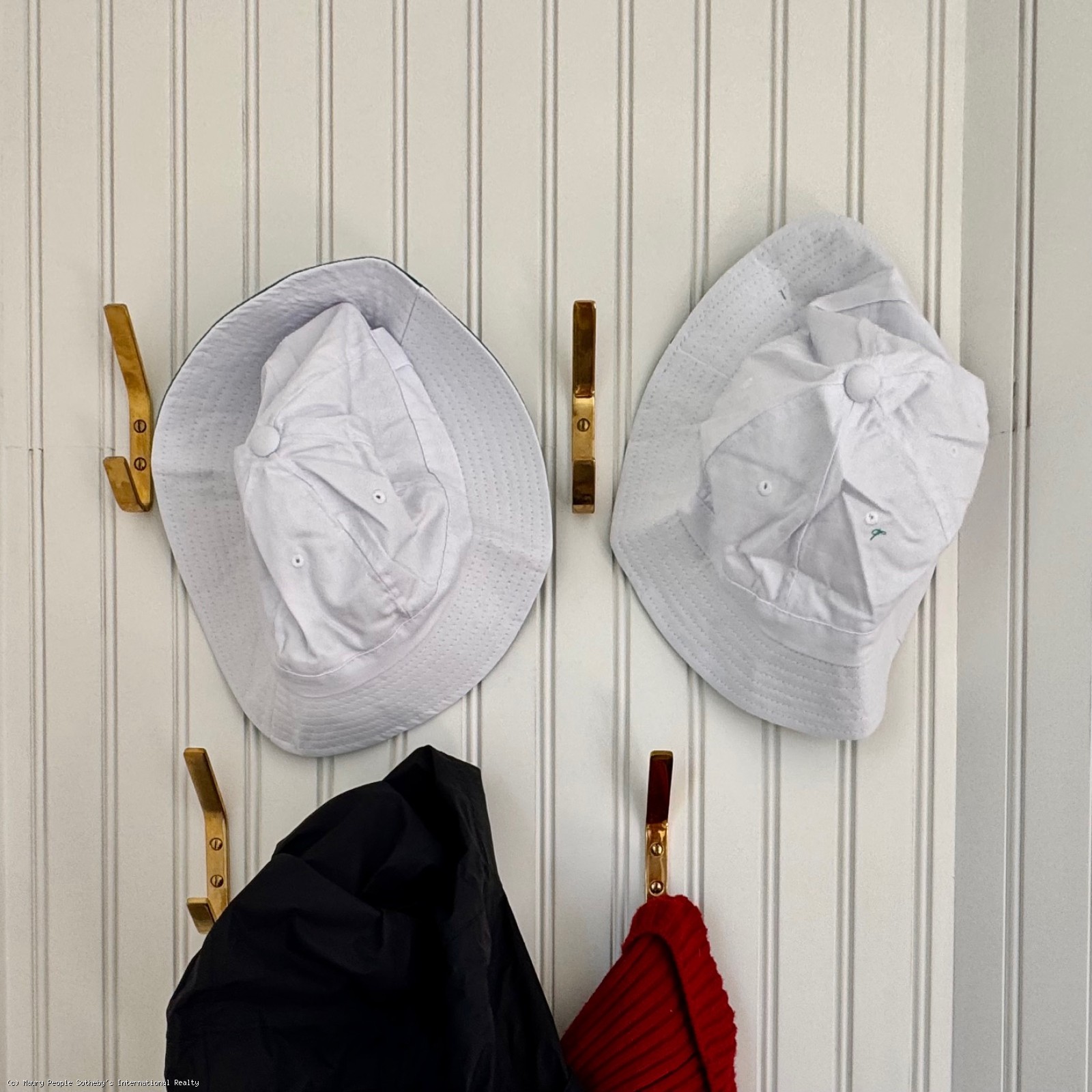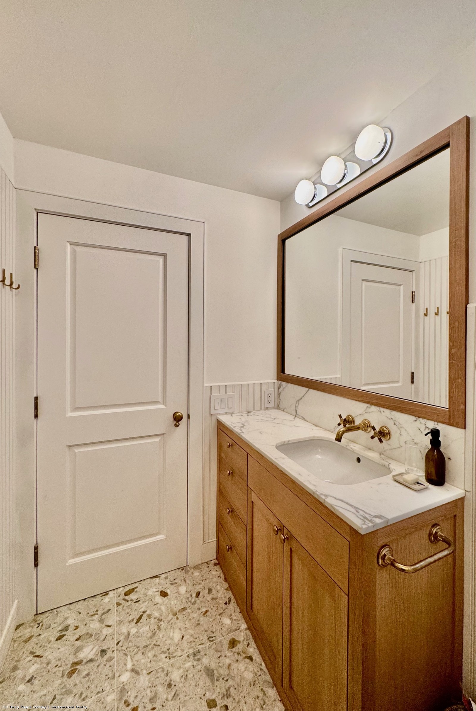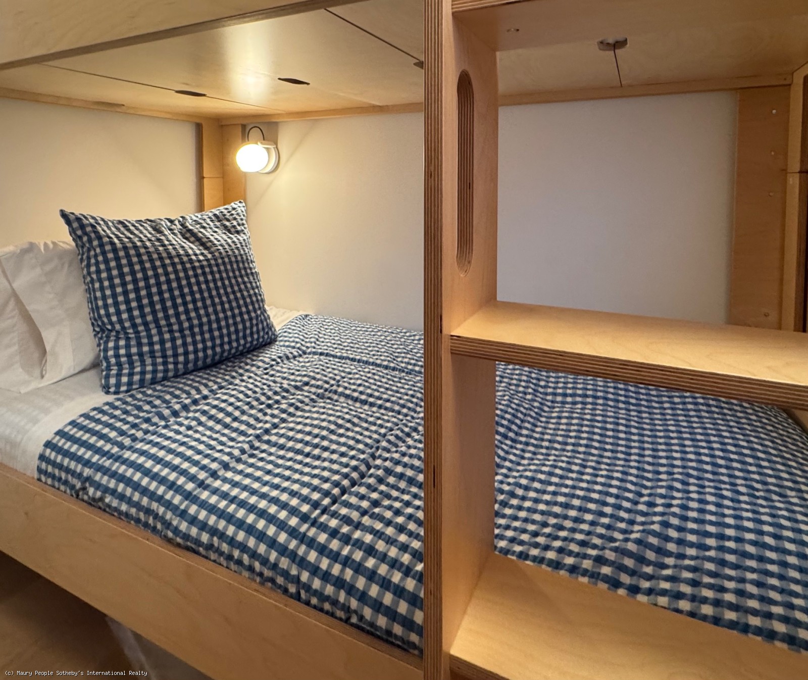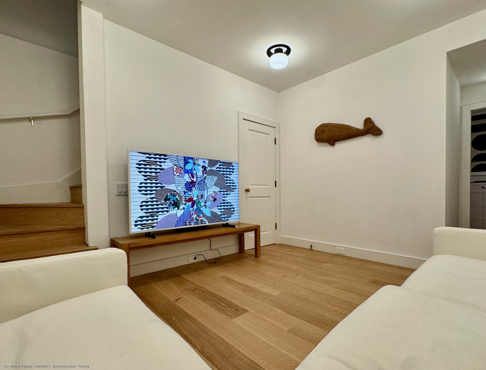 From the kitchen, circulation divides naturally into the two bedroom wings. The north wing leads first to a double-height TV room with a 75" Frame TV visible from the kitchen and a Cloud sofa for movie nights. Adjacent is a compact office with built-in desk, followed by a kids' bunkroom with four twin beds (bunks) and custom cabinetry. A nearby powder room conceals a discreet door to a full shower, convenient for children or guests returning from outdoor activities.