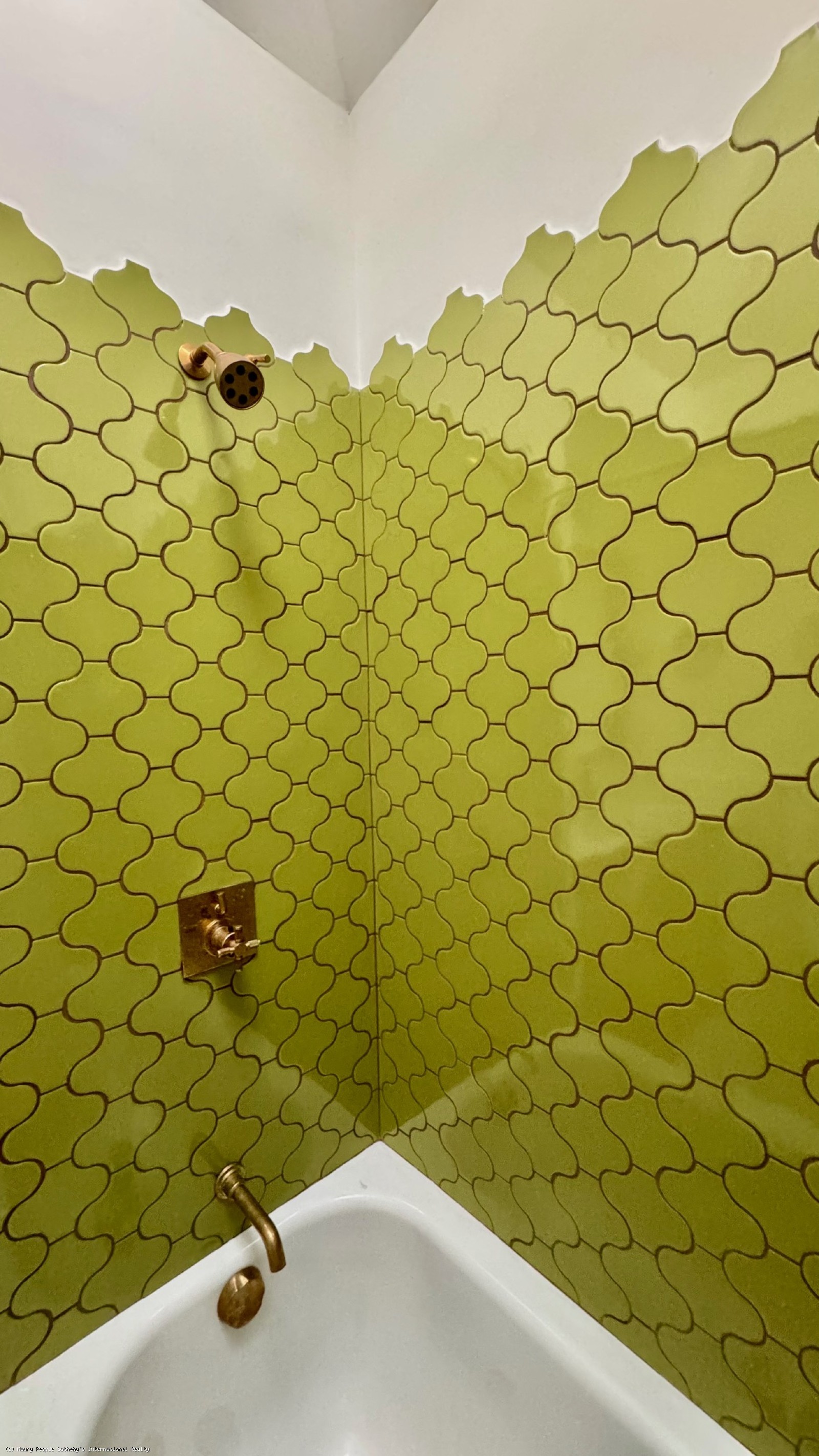 Continuing up the north stairs is the primary suite, with a king bed and a twin daybed tucked into a reading alcove. The bath includes a tub and shower, a custom oak vanity with marble top and wall-mounted fixtures, and a hanging wardrove. A 55" Frame TV is positioned for viewing from bed or alcove.