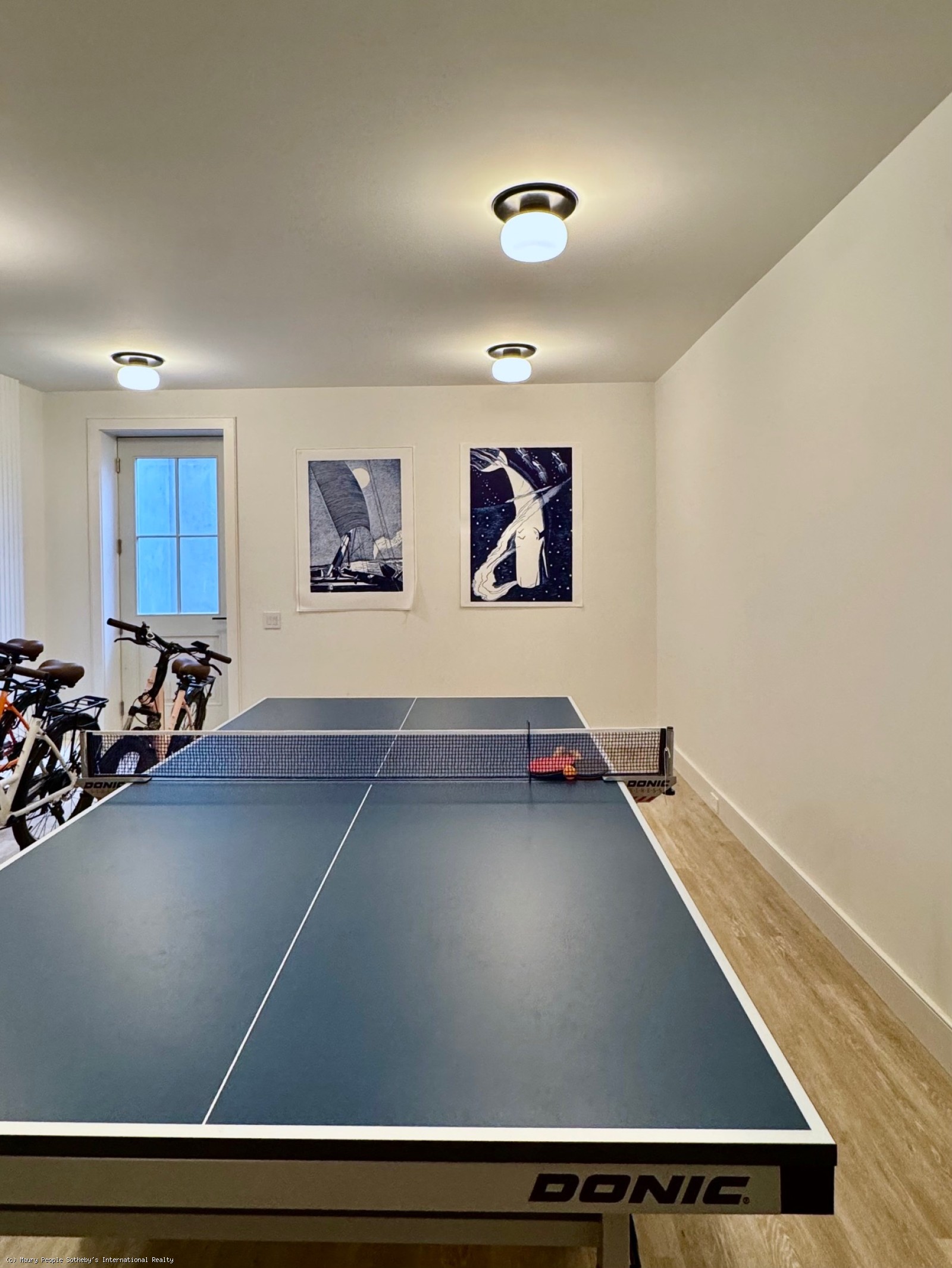 From the TV room, stairs descend to the lower level, where a kids' TV room with a 65" Frame TV opens to a full king bedroom suite. A pantry and laundry room lead to a large rec room with a professional ping-pong table and direct yard access.
